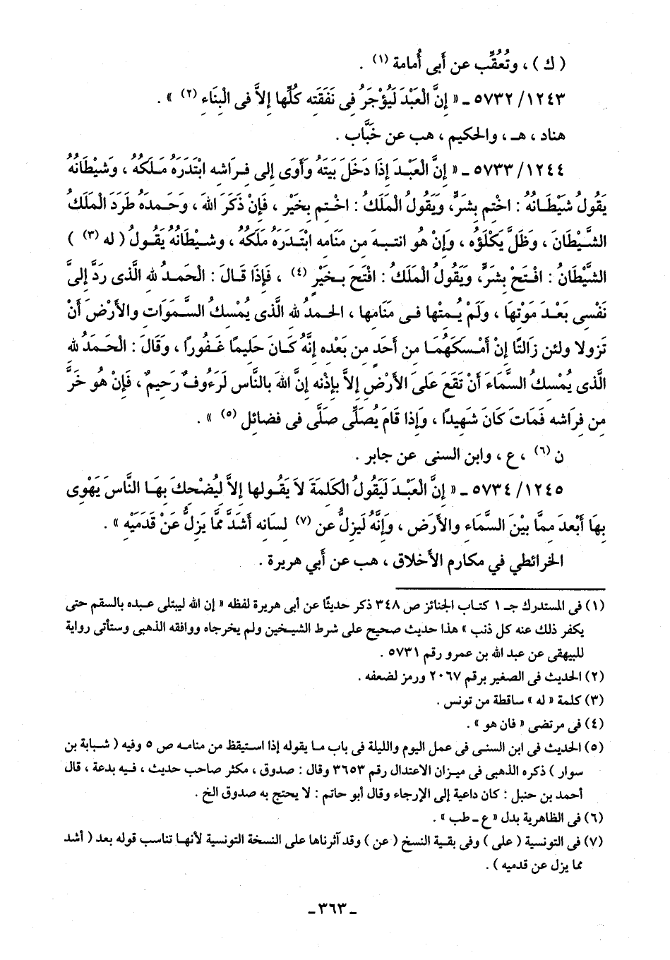 1243/ 5732 - "إِنَّ الْعَبْدَ لَيُؤْجَرُ فِي نَفَقَتِه كلها إِلَّا في الْبِنَاءِ (¬2) ".