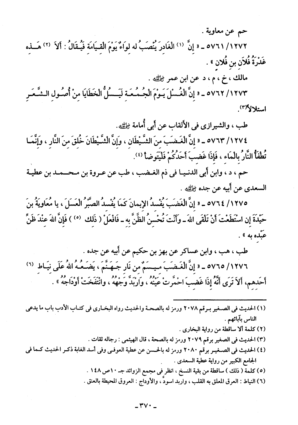 1276/ 5765 - "إِنَّ الْغَضَبَ مِيسَمٌ مِن نَارِ جَهَنَّمَ، يَضَعُهُ اللهُ عَلَى نِيَاطِ (¬6) أحَدِهِم، أَلَا تَرَى أَنَّهُ إِذَا غَضِبَ احْمَّرتْ عَيْنُهُ، وَارْبَدَّ وَجْهُهُ، وانْتَفَخَتْ أَوْدَاجُهُ".