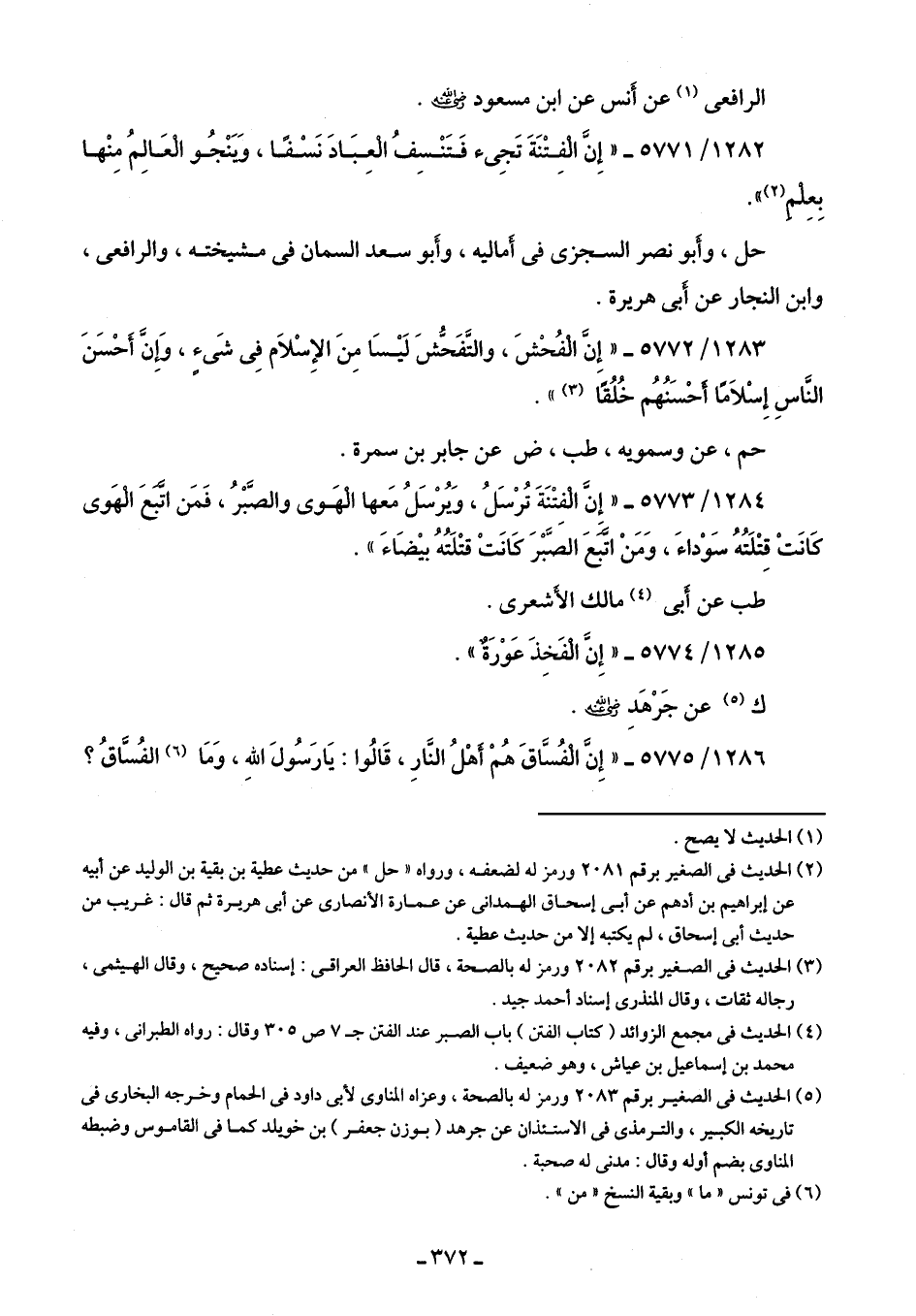 1283/ 5772 - "إِنَّ الْفُحْشَ، والتَّفَحُّشَ لَيْسَا مِنَ الإِسْلَام فِى شَئٍ، وَإنَّ أحْسَنَ النَّاسِ إِسْلَامًا أحْسَنُهُم خُلُقًا (¬3) ".