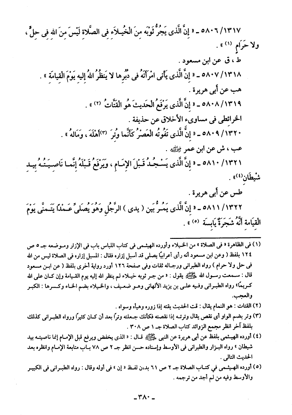 1317/ 5806 - "إِنَّ الَّذى يَجُرُّ ثَوْبَه مِنَ الْخُيلَاءِ فِى الصَّلاة لَيْسَ مِنَ اللهِ فِى حِلٍّ، ولا حَرَامٍ (¬1) ".