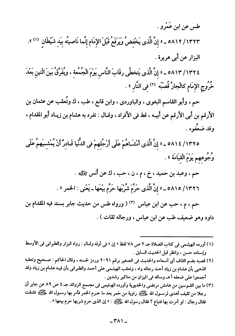1324/ 5813 - "إِنَّ الَّذى يَتخطَّى رقَابَ النَّاسِ يَوْمَ الْجُمُعةِ، ويُفَرَّقُ بَينَ اثْنينِ بَعْدَ خُرُوجِ الإِمَامِ كالْجار قُصْبَه (¬2) فِى النَّارِ".