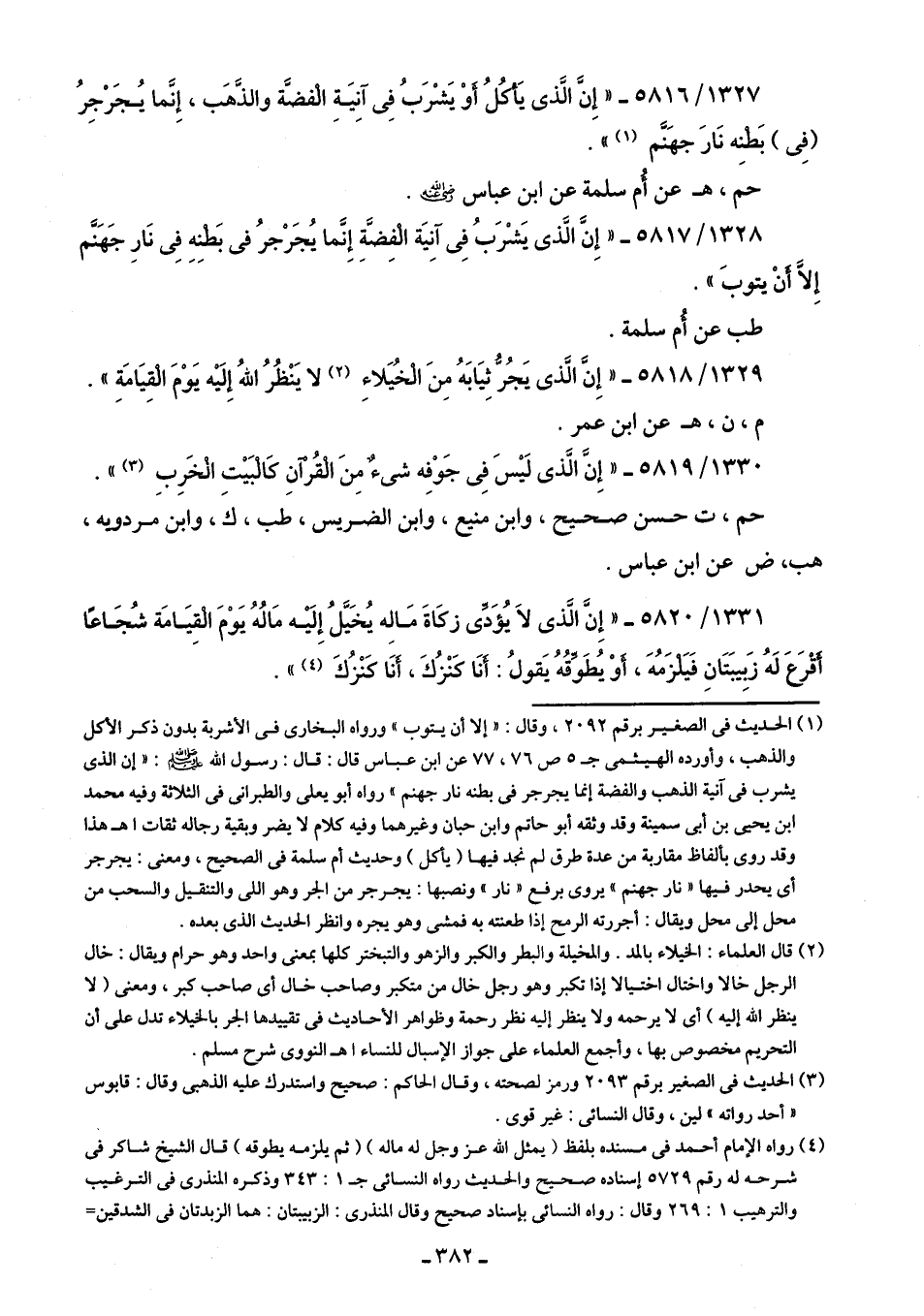 1328/ 5817 - "إِنَّ الَّذى يَشْرَبُ فِى آنِيَة الْفِضَّةِ إِنَّما يُجَرْجرُ في بَطْنِهِ فِى نَارِ جَهَنَّم إِلَّا أَنْ يتوبَ".