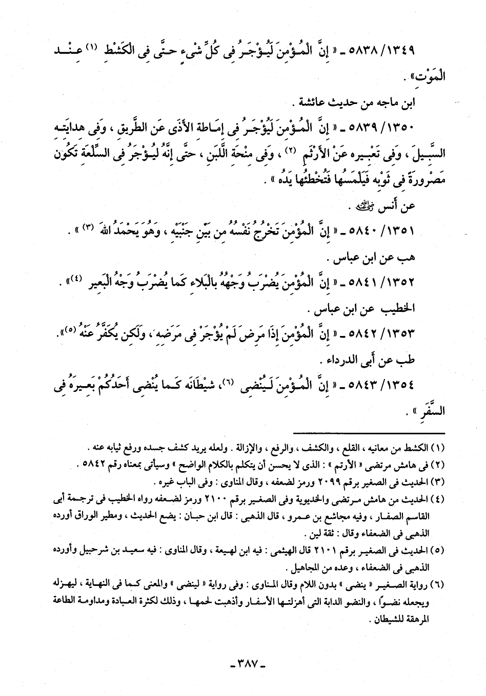 1349/ 5838 - "إِنَّ الْمُؤْمِنَ لَيُؤْجَرُ فِى كُلِّ شْئٍ حتَّى فِى الْكَشْطِ (¬1) عِنْد الْمَوْتِ".