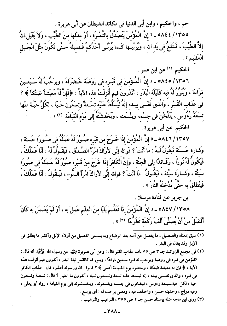 1356/ 5845 - "إِنَّ الْمُؤْمِنَ فِى قَبْرِه فِى رَوْضَة خَضْرَاءَ، ويرَحَّبُ لَهُ سَبْعينَ ذِرَاعًا، وَيُنَوَّرُ لَهُ فيه كَلَيْلَةِ الْبَدْرِ، أَتَدْرونَ فيم أُنْزِلَتْ هِذِه الآيةُ: {فَإِنَّ لَهُ مَعِيشَةً ضَنْكًا}؟ في عَذابِ الْقَبْرِ، وَالَّذى نَفْسى بِيده إِنَّهُ لَيُسَلَّطُ عَلَيْهِ تِسْعةٌ وتِسْعُون حَيّة، لِكُلِّ حَيَّة مِنْها تِسْعَةُ رُءُوسٍ، يَنْفُخْنَ في جِسْمِه ويلْسَعنه، وَيَخْدِشْنَهُ إِلى يَوْمِ الْقِيَامَةِ (¬2) ".