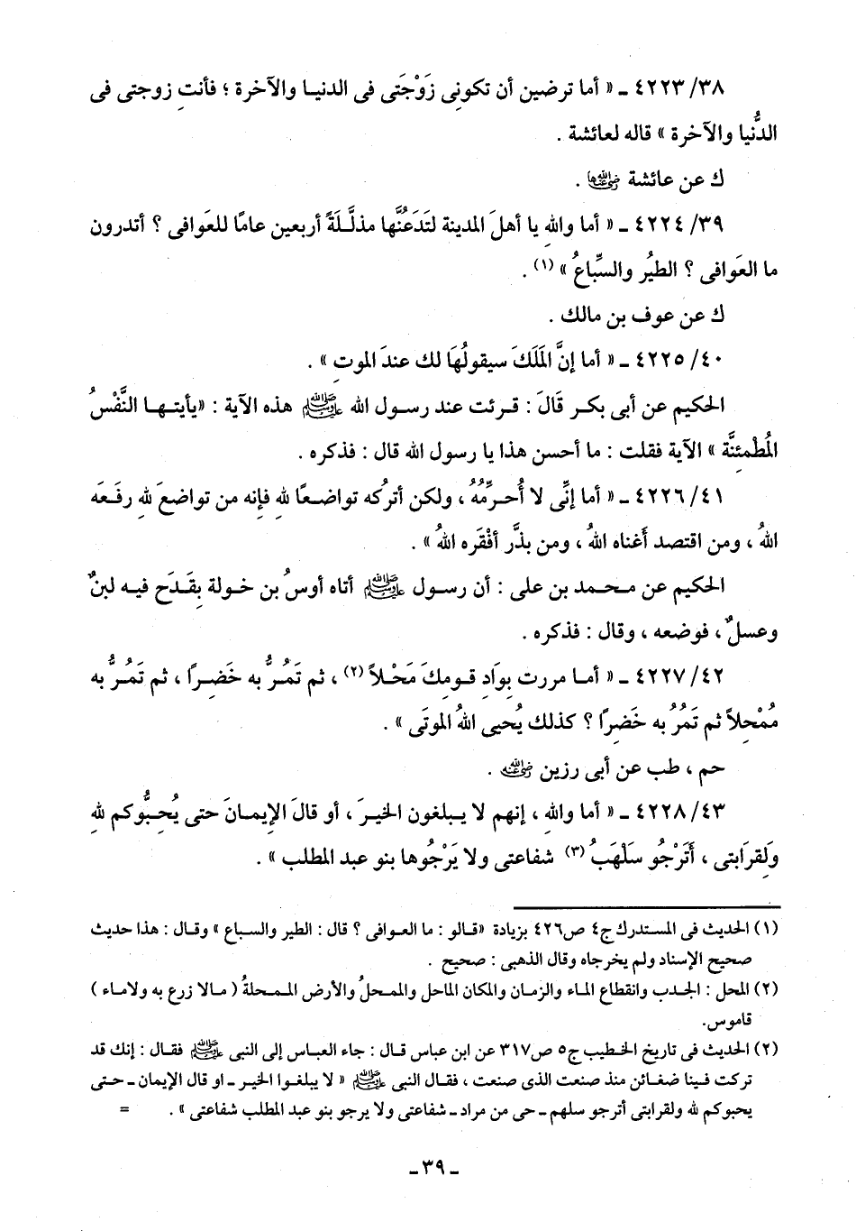 39/ 4224 - "أما والله يا أهلَ المدينة لتَدَعُنَّها مذلَّلَةً أربعين عامًا للعَوافى؟ أتدرون ما العَوافى؟ الطيرُ والسِّباعُ" (¬1).