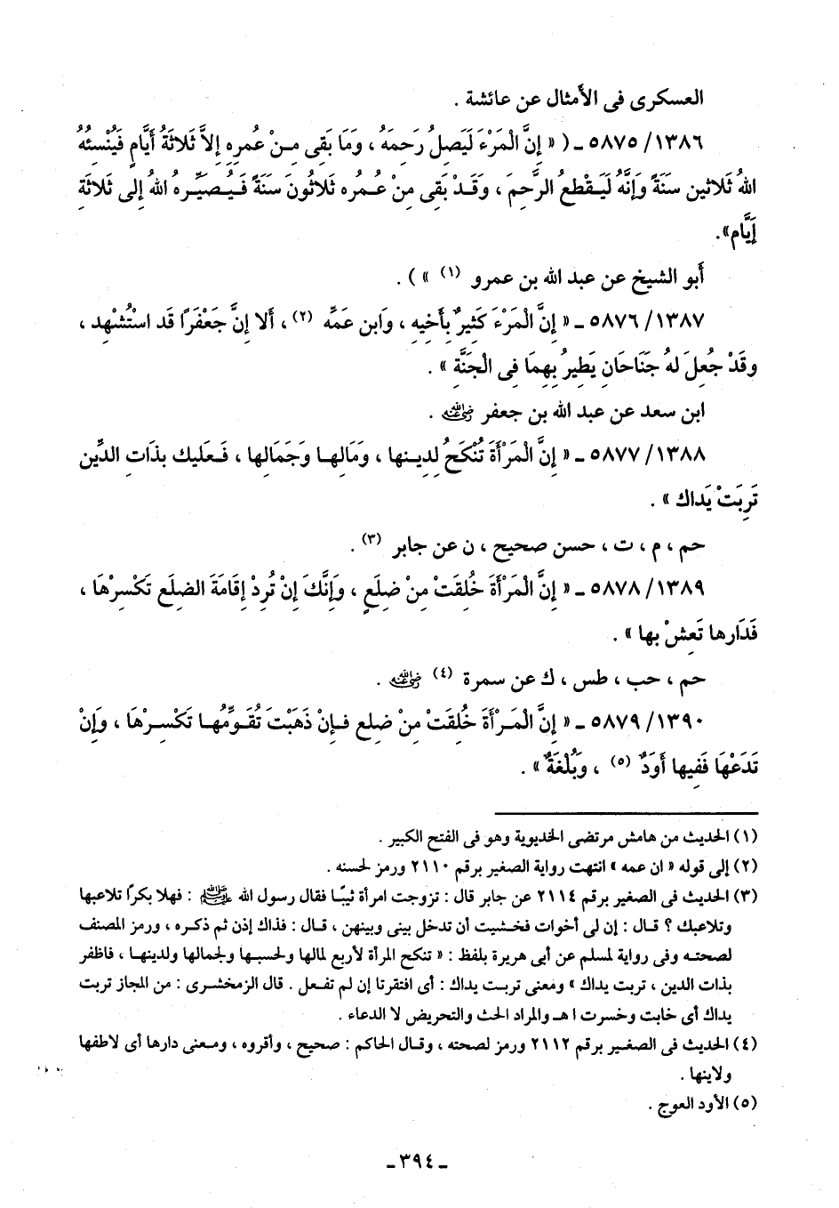 1389/ 5878 - "إِنَّ الْمَرْأَةَ خُلِقَتْ مِنْ ضِلَعٍ، وَإنَّكَ إِنْ تُرِدْ إِقَامَةَ الضِلَع تَكْسِرْهَا، فَدَارها تَعِشْ بها".