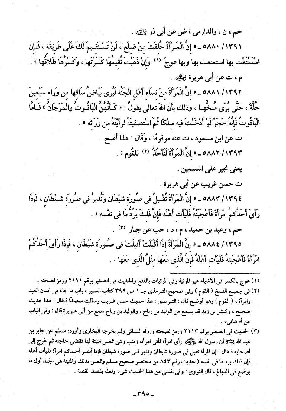 1395/ 5884 - "إِنَّ الْمَرْأَةَ إِذَا أَقْبَلَتْ أَقبلَتْ في صُورَةِ شَيْطَانِ، فَإِذَا رَأَىَ أَحَدُكُمْ امْرَأَةً فَأَعْجَبتهُ فَلْيَأْتِ أَهْلَهُ فَإِنَّ الَّذِى مَعَها مِثْلُ الَّذِى مَعَها".