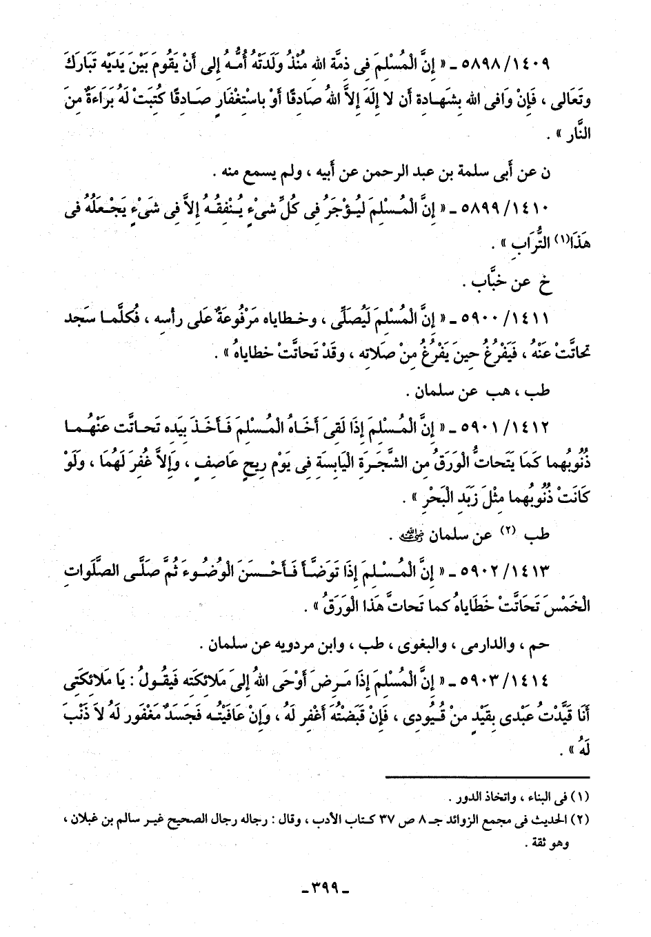 1409/ 5898 - "إِنَّ الْمُسْلِمَ فِى ذمَّة اللهِ مُنْذُ وَلَدَتْهُ أُمُّهُ إِلى أنْ يَقُومَ بَيْنَ يَدَيْه تَبَارَكَ وتَعَالى، فَإِنْ وَافى الله بِشَهادةِ أن لا إِلَهَ إِلَّا اللهُ صَادِقًا أوْ باسْتِغْفَارٍ صَادِقًا كُتِبَتْ لَهُ بَرَاءَةٌ مِنَ النَّار".