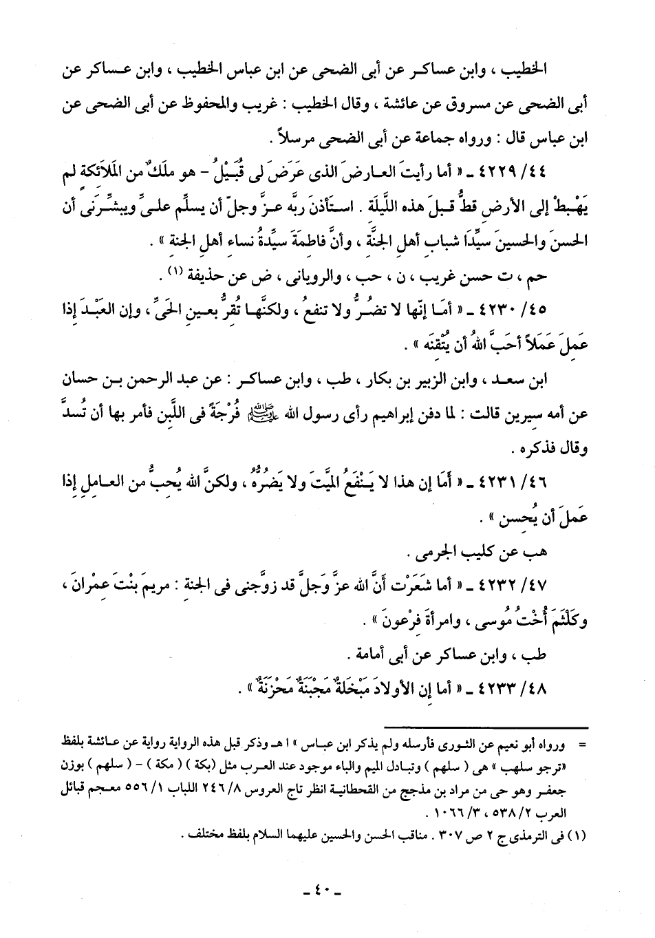44/ 4229 - "أما رأيتَ العارضَ الذي عَرَضَ لي قُبَيلُ -هو ملَكٌ من المَلائِكةٍ لم يَهْبطْ إلى الأرضِ قطُّ قبلَ هذه اللَّيلَة. استَأذنَ ربَّه عزَّ وجلّ أن يسلِّم عليَّ ويبشِّرَنى أن الحسنَ والحسينَ سيِّدَا شبابِ أهلِ الجنَّةِ، وأنَّ فاطِمَةَ سيِّدةُ نساءِ أهلِ الجنةِ".