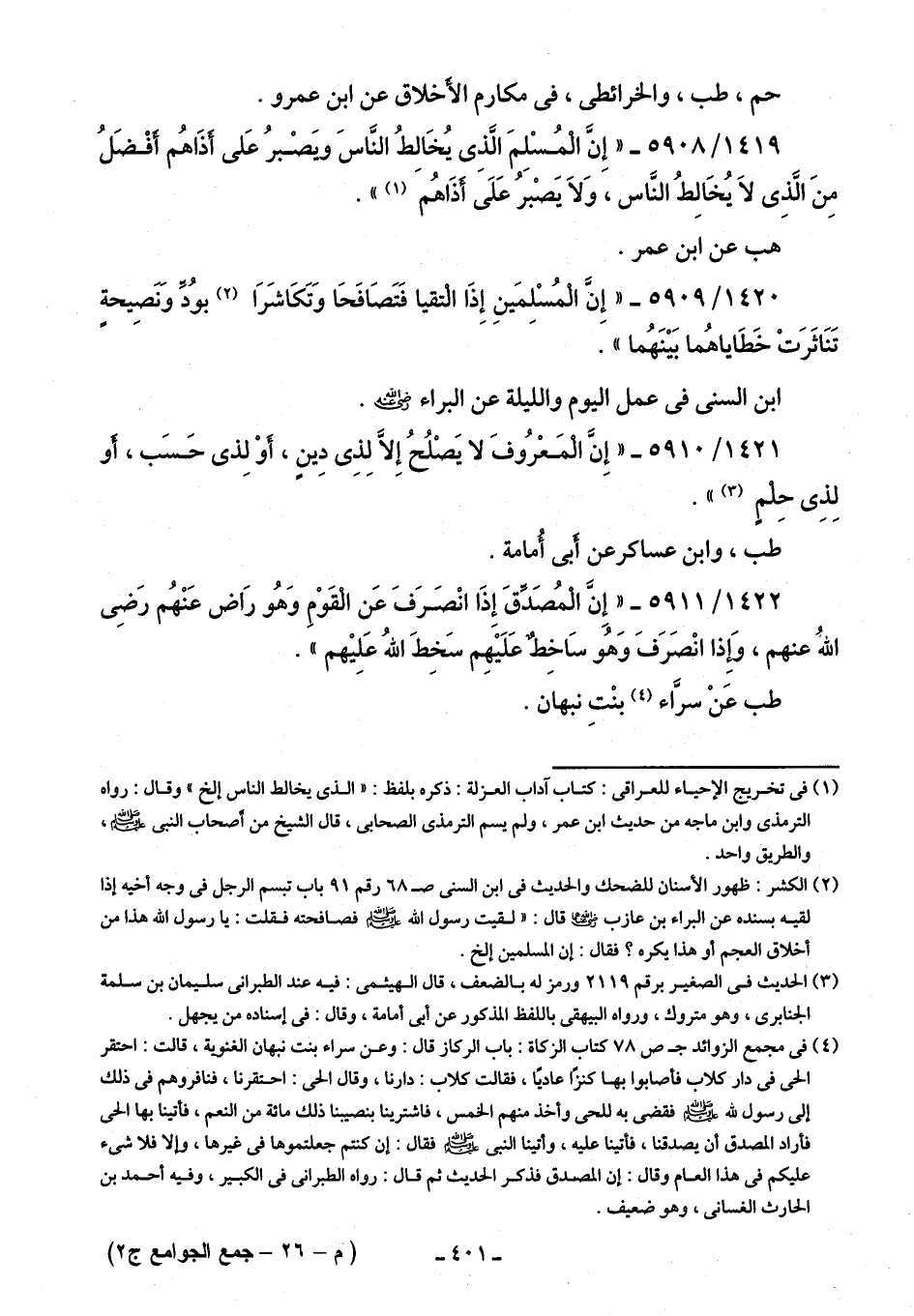1419/ 5908 - "إِنَّ الْمُسْلِمَ الَّذى يُخَالِطُ النَّاسَ ويَصْبرُ عَلى أَذَاهُم أَفْضَلُ مِنَ الَّذِى لَا يُخَالِطُ النَّاس، وَلاَ يَصْبرُ عَلَىَ أَذَاهُمَ (¬1) ".