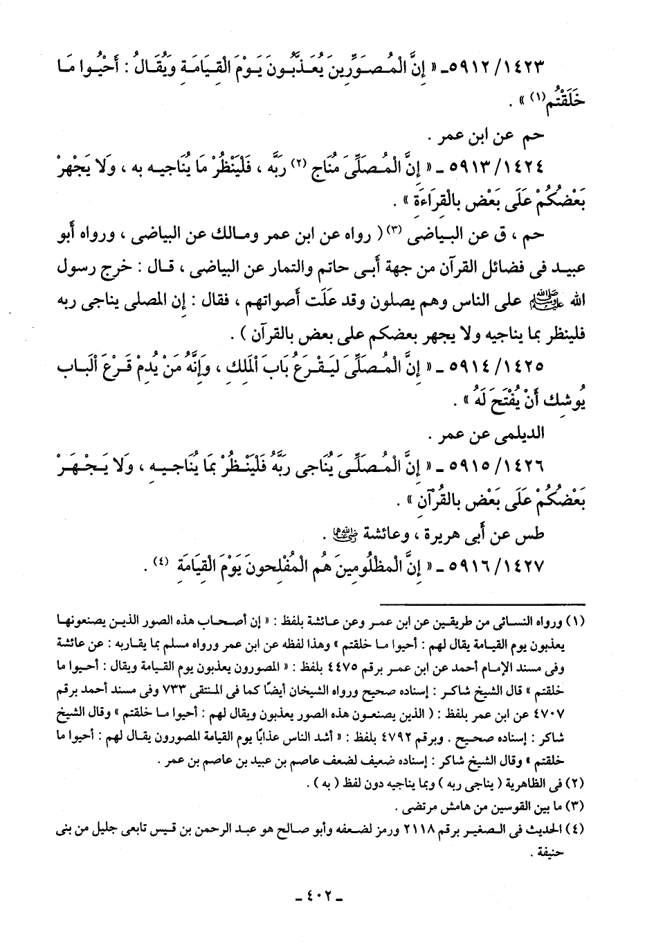 1426/ 5915 - "إِنَّ الْمُصَلِّىَ يُنَاجى رَبَّهُ فَليَنْظُرْ بمَا يُنَاجيهِ، وَلا يَجْهَرْ بَعْضُكُمْ عَلَى بَعْض بالقُرْآنِ".