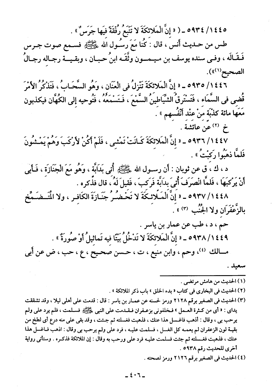 1448/ 5937 - "إِنَّ الْمَلَائِكَةَ لا تَحْضُرُ جَنَازَةَ الكَافِر، ولا المُتَضَمِّخ بالزَّعْفَرَانِ ولا الجُنُب (¬3) ".