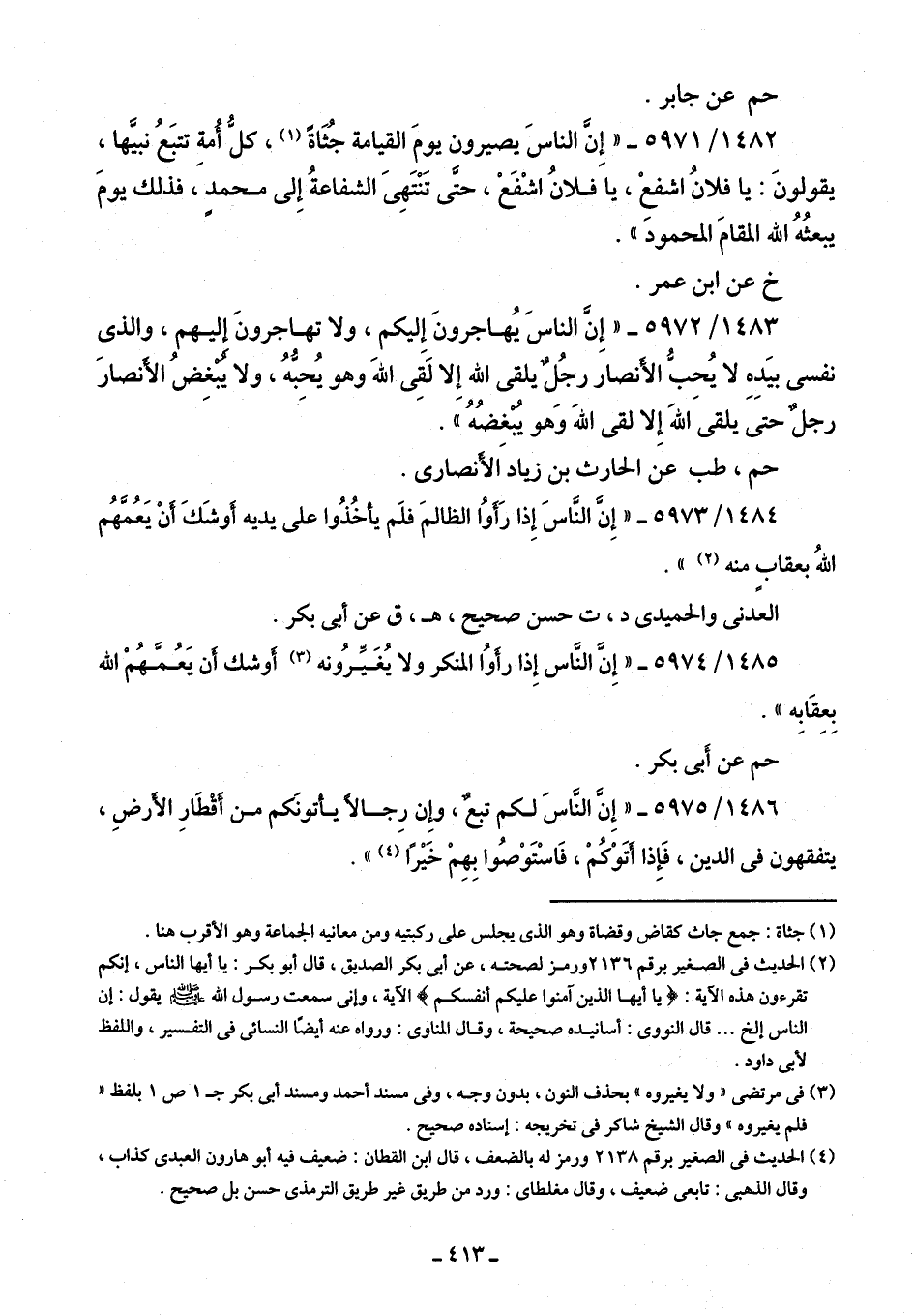 1484/ 5973 - "إِنَّ النَّاسَ إِذا رَأَوُا الظالمَ فلَم يأخُذُوا على يديه أَوشَكَ أَنْ يَعُمَّهُم اللهُ بعقابٍ منه (¬2) ".