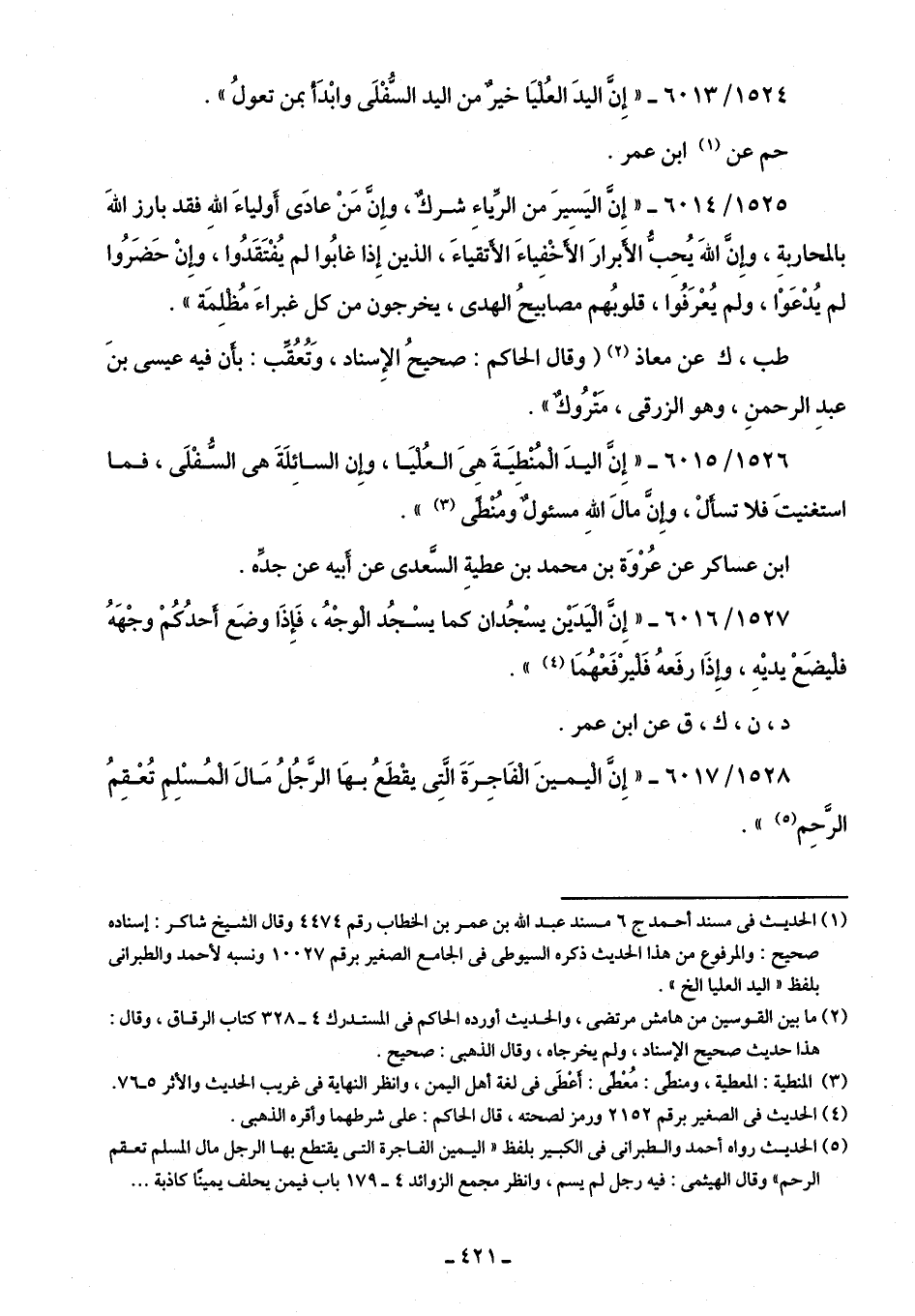 1526/ 6015 - "إِنَّ اليدَ المنطيَةَ هِىَ العُليَا، وإِن السائِلَةَ هى السُّفْلَى، فما استغنيتَ فلا تسألْ، وإنَّ مالَ اللَّهِ مسئولٌ ومُنطى (¬3) ".