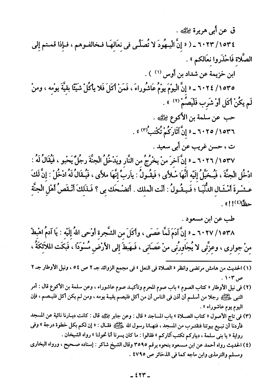 1534/ 6023 - ("إِنَّ اليهُودَ لا تُصَلِّى في نِعَالِهَا فخالفوهم، فإِذا قمتم إِلى الصَّلاةِ فَاحْذَروا نِعَالكم".