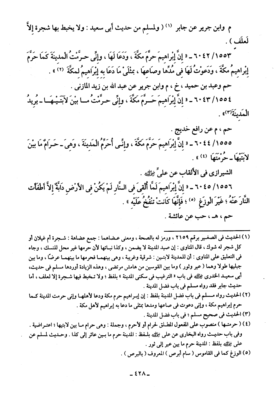1553/ 6042 - "إِنَّ إِبْراهِيمَ حرَّمَ مكَّةَ، وَدَعَا لَهَا، وإنِّى حرَّمْتُ المدينَةَ كَمَا حَرَّمَ إِبْراهِيمُ مكَّةَ، وَدَعوْتُ لَهَا فِى مُدِّها وصَاعِهَا، بمثْلَىْ مَا دَعَا بِهِ إِبْرَاهِيمُ لِمكَّةَ (¬2) ".