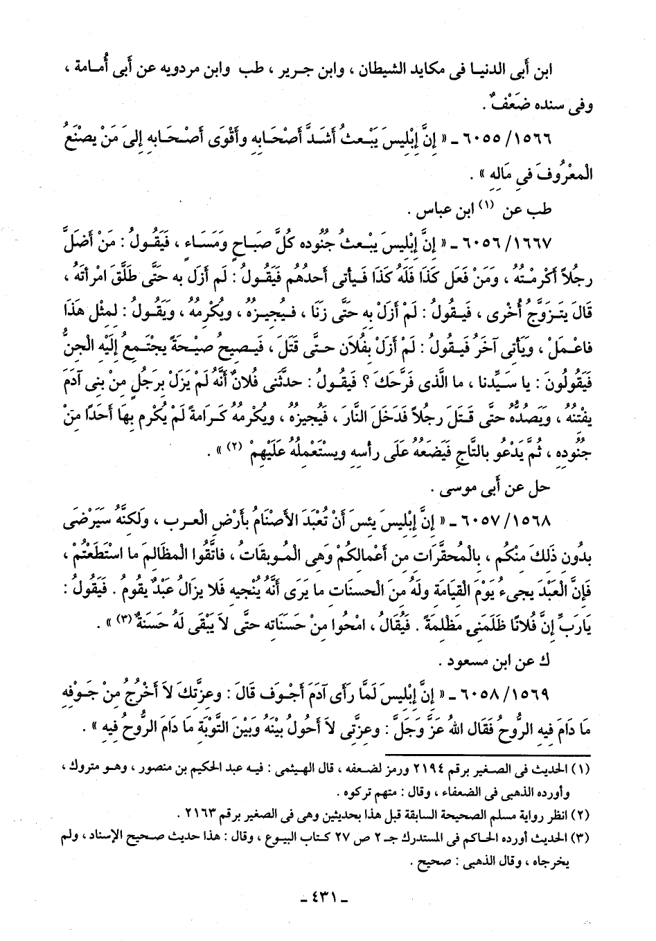 1667/ 6056 - "إِنَّ إِبْلِيسَ يبْعثُ جُنُوده كُلَّ صَباحٍ وَمَسَاءٍ، فَيَقُولُ: مَنْ أَضَلَّ رجُلًا أكْرمْتُهُ، وَمَنْ فَعَل كَذَا فَلَهُ كَذَا فَيأتى أحدُهُم فَيَقُولُ: لَم أزَل به حَتَّى طَلَّقَ امْرأتَهُ، قَالَ يتَزَوَّجُ أُخْرى، فَيقُولُ: لَمْ أَزَلْ بِهِ حَتَّى زَنَا، فيُجِيزُهُ، ويُكْرِمُهُ، وَيَقُولُ: لِمِثْل هَذَا فاعْمَلْ، وَيَأتِى آخَرُ فَيقُولُ: لَمْ أزَلْ بِفُلَان حتَّى قَتَلَ، فَيصِيحُ صيْحَةً يجْتَمِعُ إِلَيْهِ الجِنُّ فَيَقُولُونَ: يا سَيِّدنا، ما الذى فَرحَّكَ؟ فَيقُولُ: حدَّثَنى فُلانٌ أَنَّهُ لَمْ يَزَلْ بِرَجُل مِنْ بنِى آدَمَ يفْتِنُهُ، وَيَصُدُّهُ حتَّى قَتَلَ رَجُلًا فَدَخَلَ النَّارَ، فَيُجيزُهُ، ويُكْرمُهُ كَرَامةً لَمْ يُكْرم بِهَا أحَدًا مِن جُنُودِهِ، ثُمَّ يَدْعُو بالتَّاجِ فَيَضَعُهُ عَلَى رأْسِهِ ويستعْمِلُهُ عَلَيْهِمْ (¬2) ".