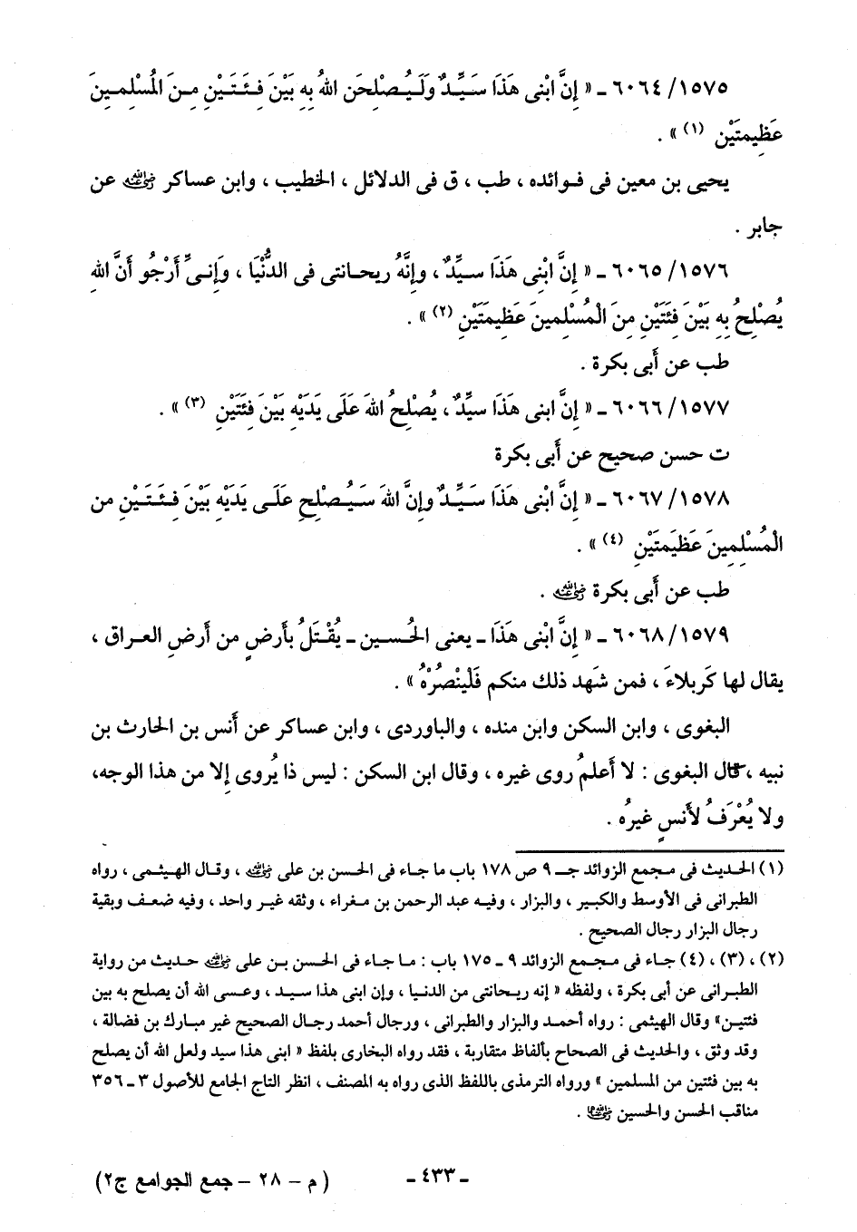 1575/ 6064 - "إِنَّ ابْنى هَذَا سَيِّدٌ وَلَيُصْلِحَن اللَّهُ بِهِ بَيْنَ فِئَتَيْنِ مِنَ المُسْلِميِنَ عَظِيمتَيْن (¬1) ".