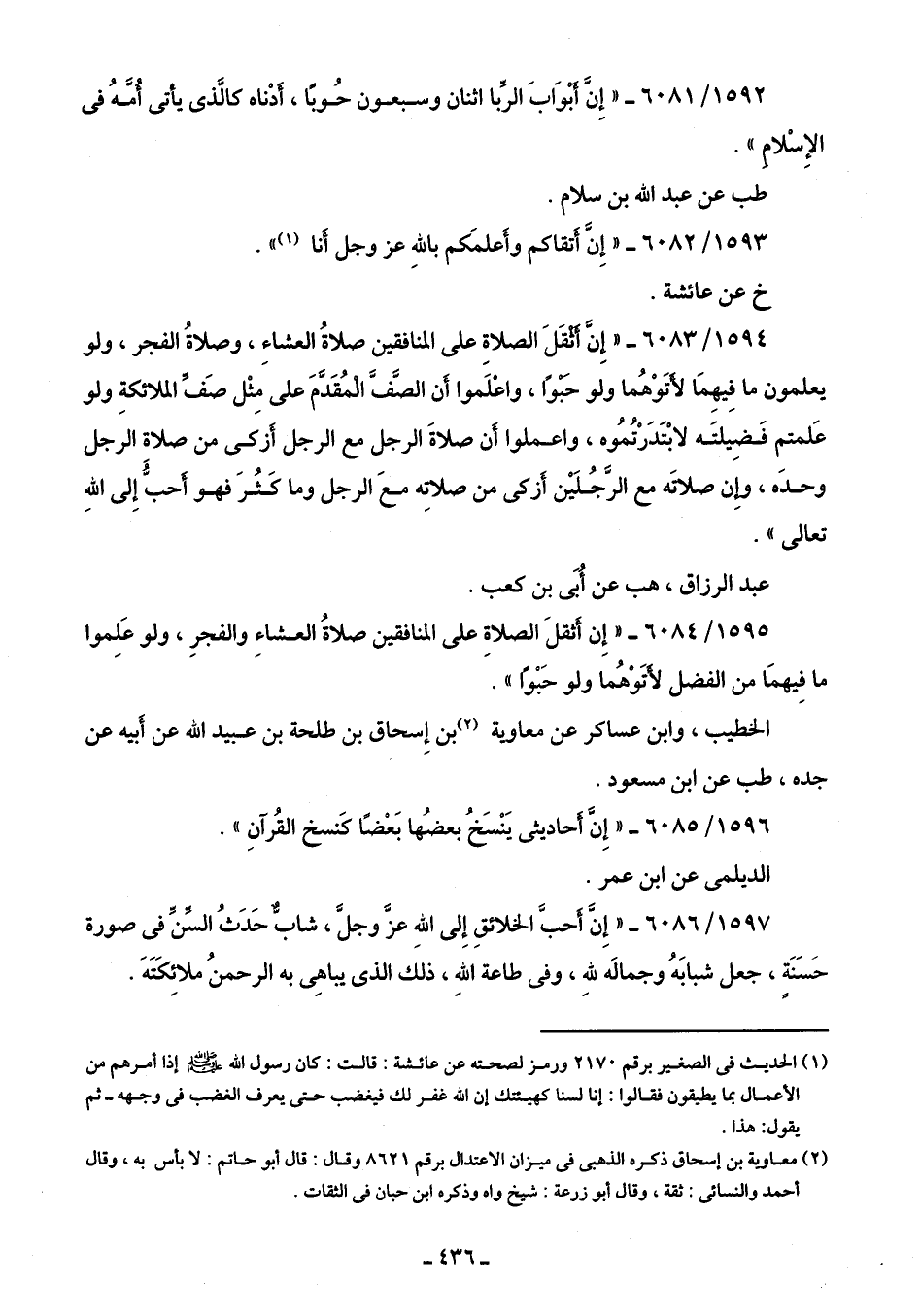 1595/ 6084 - "إِنّ أَثقلَ الصلاةِ على المنافقين صلاةُ العشاءِ والفجرِ، ولو عَلِموا ما فِيهمَا من الفضل لأَتَوْهُما ولو حَبْوًا".