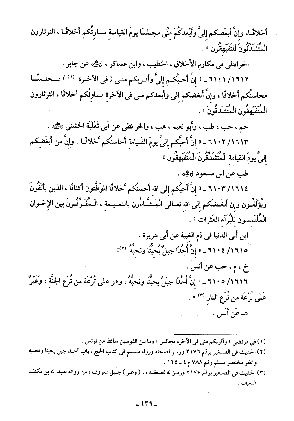 1614/ 6103 - "إِنَّ أحبَّكم إِلى اللَّه أَحسنُكم أخلاقًا الموَطَّئون أكنافًا، الذين يألَفُونَ ويُؤْلَفُون وإِنَّ أَبغَضَكم إِلى اللَّهِ تعالى المشَّاءُون بالنميمةِ، المُفَرِّقُونَ بين الإِخوان المُلْتَمِسون لِلبُرآءِ العَثرات".