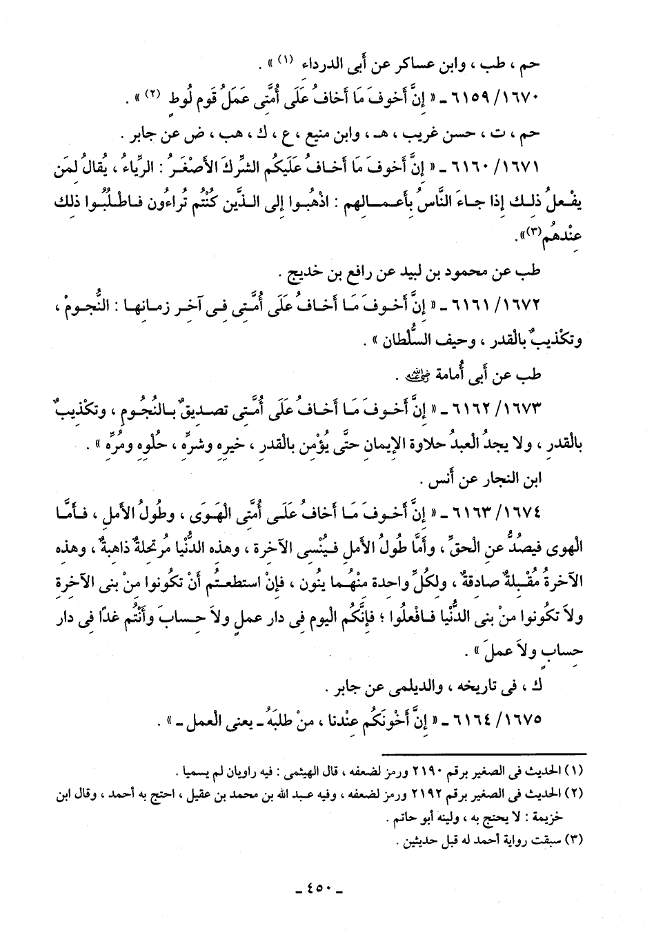 1672/ 6161 - "إِنَّ أَخوفَ مَا أَخافُ عَلَى أُمَّتِى فِى آخِر زمانِها: النُّجومْ، وتكْذيبٌ بالْقدر، وحيف السُّلْطان".