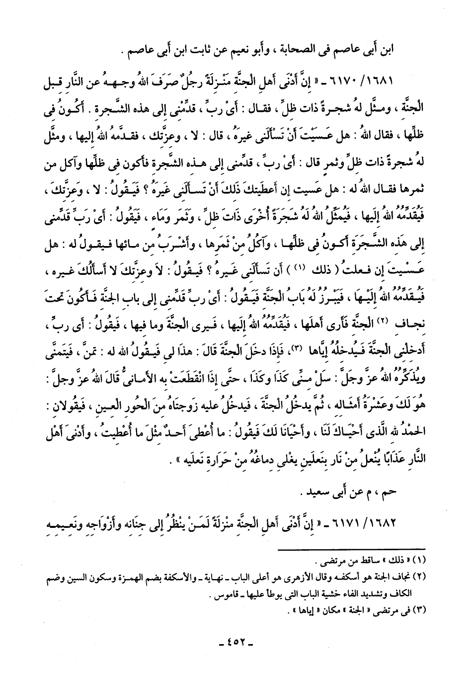 1681/ 6170 - "إِنَّ أَدْنَى أَهلِ الْجنَّة مَنْزِلَةً رجُلٌ صَرَفَ اللَّه وجههُ عن النَّارِ قِبل الجنَّةِ، ومثَّل لهُ شجرةً ذات ظِلِّ، فقال: أَىْ ربِّ، قدِّمْنِى إِلى هذه الشَّجرةِ. أَكُونُ فِى ظلِّها، فقال اللَّهُ: هل عَسَيْتَ أَنْ تَسْأَلَنى غيرَهُ، قال: لا، وعِزَّتِك، فقدَّمهُ اللَّهُ إِليها، ومثَّل لهُ شجرةً ذات ظِلٍّ وثمرٍ قال: أَىْ ربِّ، قدِّمنى إِلى هذِه الشَّجرةِ فأكون فِى ظلَّها وآكل من ثمرها فقال اللَّه له: هل عَسيت إِنّ أَعطَيتكَ ذَلِكَ أَنْ تَسألَنِى غَيرَهُ؟ فَيَقُولُ: لا، وَعِزَّتِكَ، فَيُقَدِّمُهُ اللَّهُ إِلَيها، فَيُمَثِّلُ اللَّهُ لَهُ شَجَرَةً أُخْرَى ذَاتَ ظِلِّ، وَثَمَر وَمَاءٍ، فَيَقُولُ: أَىْ رَبِّ قَدِّمنى إِلى هذِه الشَّجَرَةِ أَكونُ فِى ظلِّها، وآكُلُ مِنْ ثَمَرِها، وأَشْرَبُ مِن مائها فيقولُ له: هل عَسْيتَ إِن فعلتُ (ذلك) (¬1) أَن تَسأَلَنِى غَيرهُ؟ فَيقُولُ: لَا وعِزَّتِكَ لا أَسألُكَ غيره، فَيُقَدِّمُهُ اللَّهُ إِلَيْهَا، فَيَبْرُزُ لَهُ بَابُ الْجَنَّةِ فَيَقُولُ: أَىْ ربِّ قَدِّمنِى إِلى بابِ الجنَّةِ فأَكُونَ تحتَ نِجافِ (¬2) الْجنَّةِ فَأَرى أَهلَها، فَيُقَدِّمُهُ اللَّهُ إِلَيها، فَيرى الْجنَّةَ وما فِيها، فَيقُولُ: أَى ربِّ، أَدخِلْنِى الْجنَّةَ فَيُدخلُهُ إِيَّاها (¬3)، فَإِذَا دخَلَ الْجنَّةَ قَالَ: هذَا لىِ فَيقُولُ اللَّه له: تمنَّ، فَيتَمنَّى ويُذَكِّرُهُ اللَّهُ عزَّ وجَلَّ: سَلْ مِنِّى كَذَا وكَذَا، حتَّى إِذَا انْقَطَعَتْ بِه الأَمانىُّ قَالَ اللَّهُ عزَّ وجلَّ: هُوَ لَكَ وعَشْرَةُ أَمثَالِهِ، ثُمَّ يدخُلُ الْجنَّةَ، فَيدخُلُ عليه زَوجتَاهُ مِنَ الْحُورِ الْعِينِ، فَيقُولانِ: الحمْدُ للَّهِ الَّذى أَحْيَاكَ لَنَا، وأَحْيَانَا لَكَ فَيقُولُ: ما أُعْطىَ أَحدٌ مِثْلَ ما أُعْطِيتُ، وأَدْنى أَهْل النَّارِ عَذَابًا يُنْعلُ مِنْ نَار بِنَعلَينِ يغْلىِ دِماغُهُ مِنْ حَرَارةِ نَعلَيه".