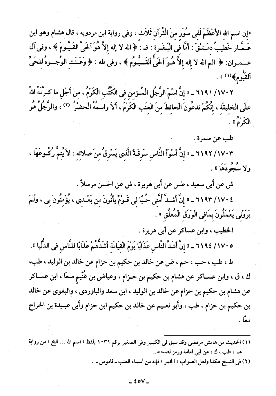 1702/ 6191 - "إِنَّ اسْمَ الرَّجُل الْمُؤمِنِ فِى الْكُتُبِ الْكَرْمُ، مِنْ أَجْلِ ما كرمَّهُ اللَّهُ علَى الْخليقَة، إِنَّكُمْ تدعُونَ الْحائطَ مِنَ الْعنَب الْكَرْمَ، أَلَا واسمُهُ الْحضْرُ (¬2)، والرَّجُلُ هُو الْكَرْمُ".