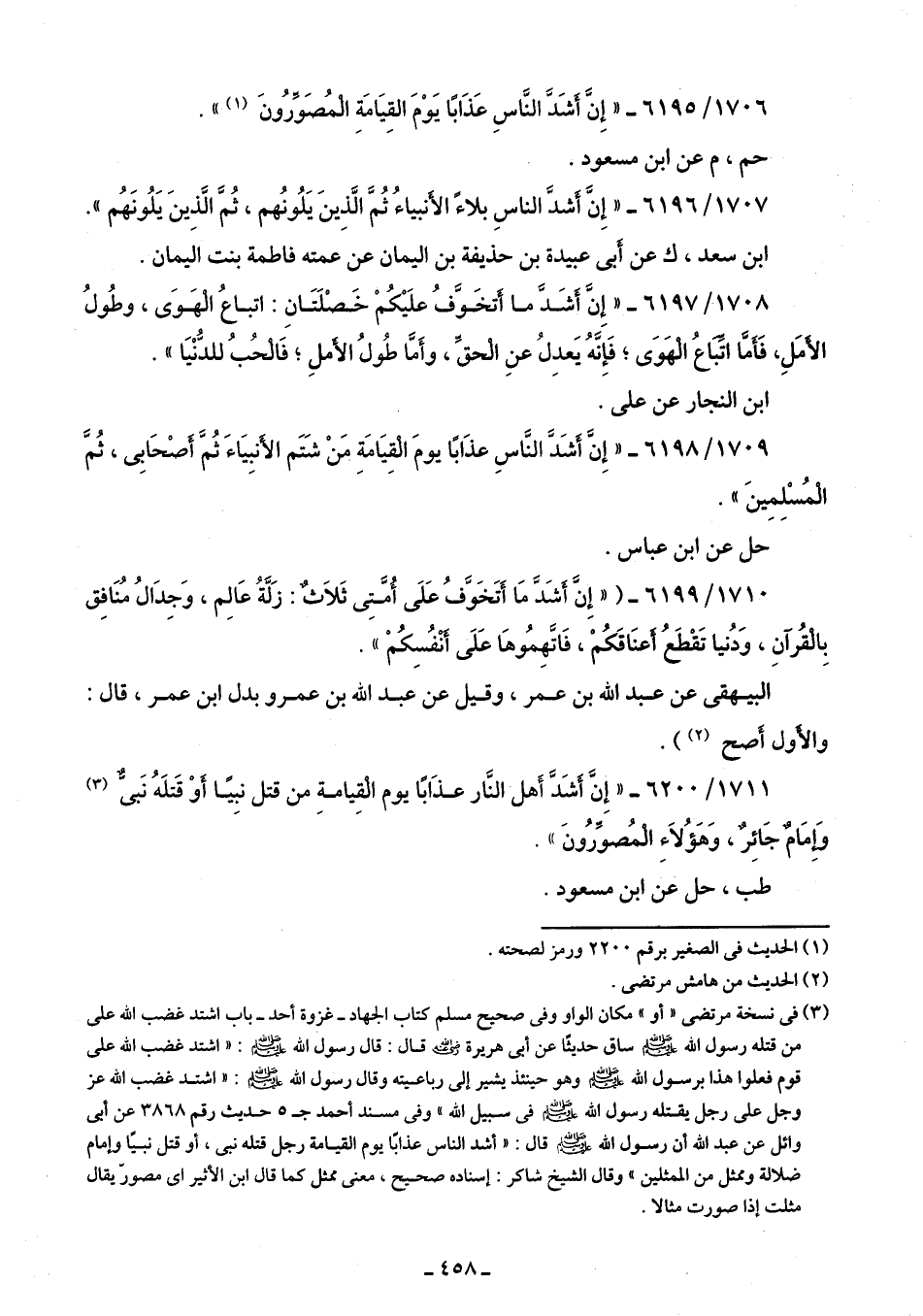1711/ 6200 - "إِنَّ أَشَدَّ أَهل النَّار عذَابًا يوم الْقِيامةِ من قتل نبِيًا أَوْ قَتلَهُ نَبىٌّ (¬3) وَإمَامٌ جَائِرٌ، وَهَؤُلَاءِ الْمُصوِّرُونَ".