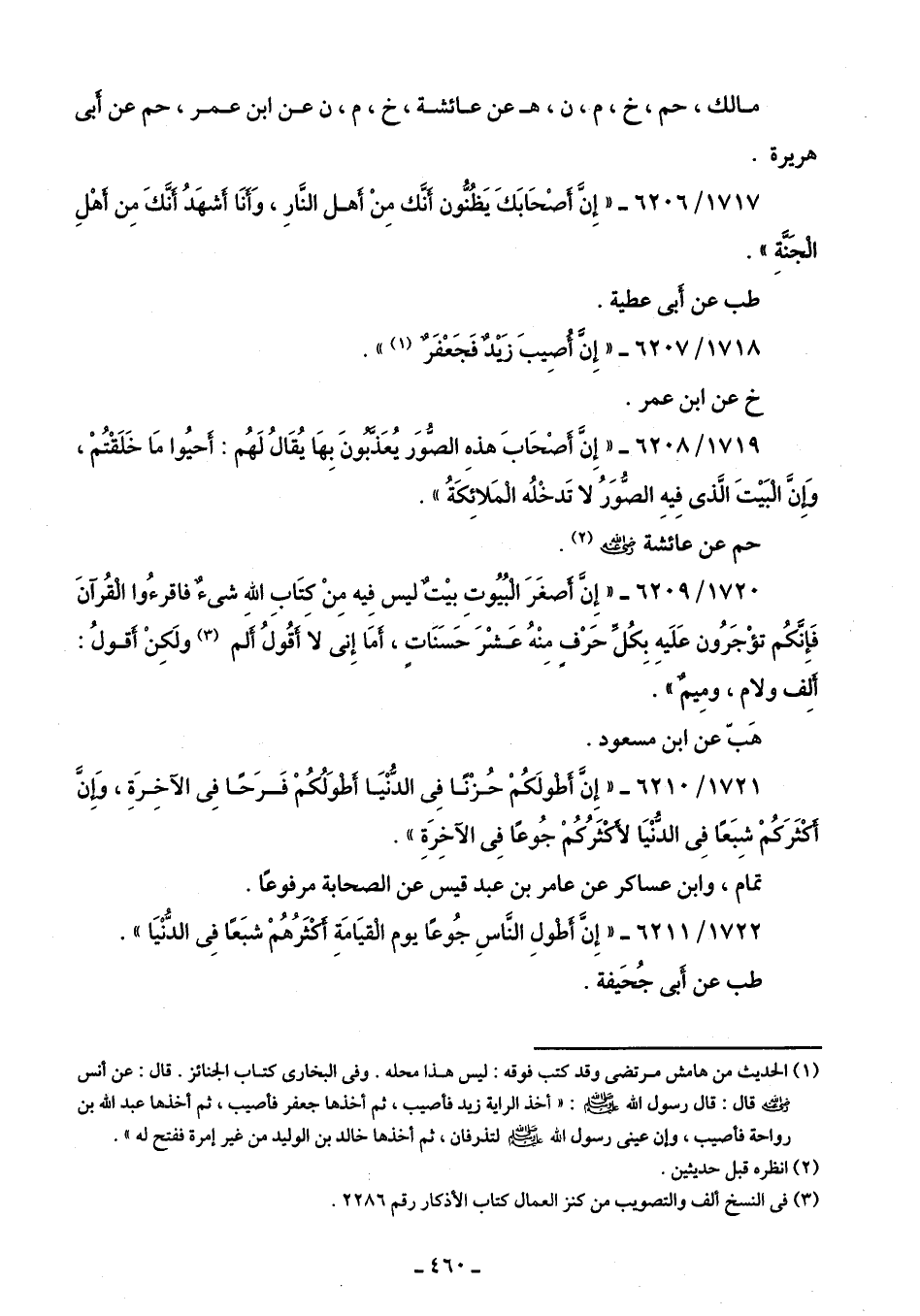 1721/ 6210 - "إِنَّ أَطْولَكُمْ حُزْنًا فِى الدُّنْيَا أَطْوَلُكُمْ فَرَحًا فِى الآخِرَةِ، وَإِنَّ أَكْثَرَكُمْ شِبَعًا فِى الدُّنْيَا لأَكْثَرُكُمْ جُوعًا فِى الآخِرَةِ".