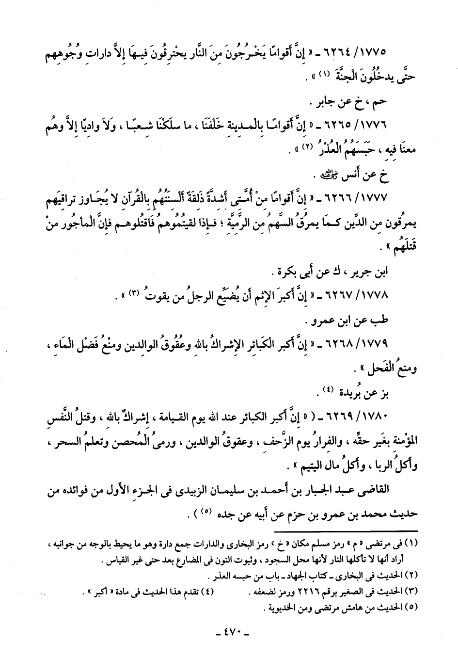 1775/ 6264 - "إِنَّ أَقوامًا يَخْرُجُونَ مِنَ النَّار يحْترِقُونَ فِيهَا إِلَّا دارات وُجُوهِهم حتَّى يدخُلُونَ الْجنَّةَ (¬1) ".