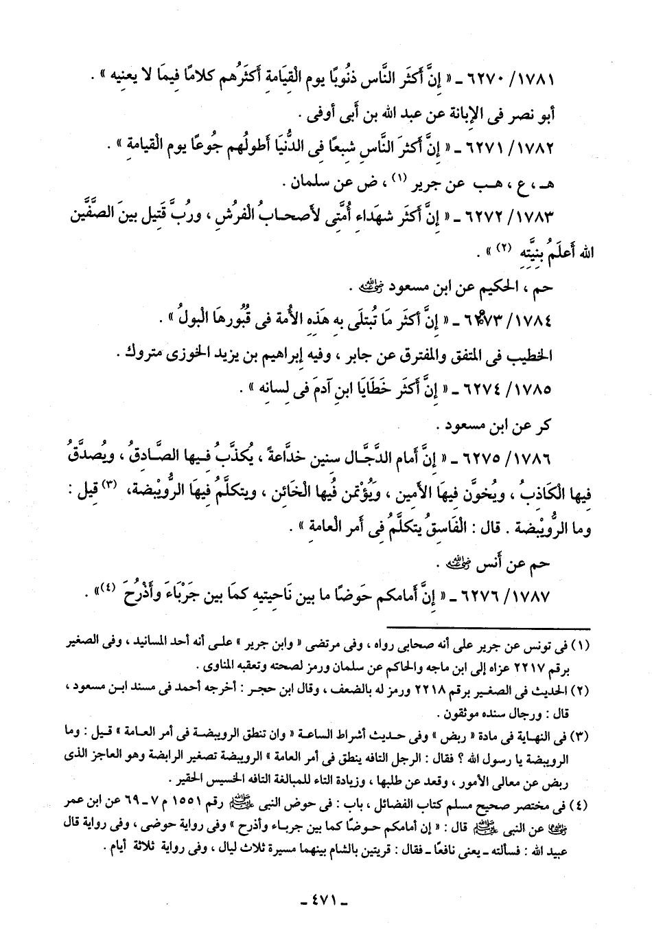 1786/ 6275 - "إِنَّ أَمام الدَّجَّال سِنين خدَّاعةً، يُكذَّبُ فِيها الصَّادِقُ، ويُصدَّقُ فِيها الْكَاذِبُ، ويُخوَّن فيِهَا الأَمِين، وَيُؤْتمن فُيها الْخَائِن، ويتكلَّمُ فِيهَا الرُّويْبضة، (¬3) قِيل: وما الرُّويْبضة. قال: الْفَاسِقُ يتكلَّمُ فِى أَمر الْعامةِ".