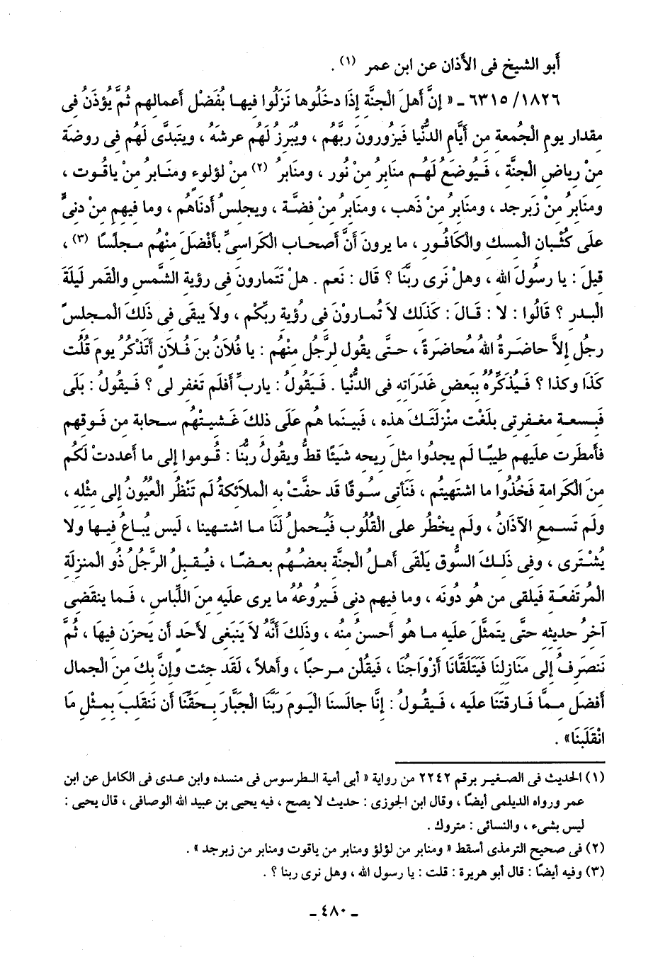 1826/ 6315 - "إِنَّ أهلَ الجنَّةِ إِذَا دخَلُوها نَزَلُوا فِيها بُفَضْل أعمالِهم ثُمَّ يُؤذَنُ في مِقدار يومِ الجُمعة مِن أيَّامِ الدُّنيا فَيزُورونَ ربَّهُم، ويُبَرِزُ لَهُم عرشَهُ، ويتَبدَّى لَهُم في روضَة مِنْ رِياضِ الجنَّةِ، فَيُوضعُ لَهُم منَابِرُ مِنْ نُور، ومنَابرُ (¬2) مِنْ لؤلوء ومنَابرُ مِنْ ياقُوت، ومنَابِرُ منْ زَبرجد، ومنَابِرُ مِنْ ذَهب، ومنَابِرُ مِنْ فِضة، ويجلِسُ أدنَاهُم، وما فيهِم مِنْ دنِىٍّ علَى كُثْبانِ الْمِسكِ والْكافُورِ، ما يرونَ أَنَّ أصحاب الكَراسِىِّ بأَفْضَلَ مِنْهُم مجلسًا (¬3)، قِيلَ: يا رسُولَ اللَّهِ، وهلْ نَرى ربَّنَا؟ قَال: نَعم. هلْ تَتَمارونَ في رؤيةِ الشَّمسِ والْقَمر لَيلَةَ الْبدرِ؟ قَالُوا: لا: قَالَ: كَذَلِك لَا تُماروْنَ في رُؤيةِ ربِّكْم، ولَا يبقَى في ذَلِكَ المجلِس رجُل إِلَّا حاضَرةُ اللَّهُ مُحاضَرةً، حتَّى يقُول لِرَّجُل مِنْهُم: يا فُلَانُ بنَ فُلَانٍ أتَذْكرُ يومَ قُلُت كَذَا وكذا؟ فَيُذَكرُهُ بِبَعضِ غَدَرَاتِهِ في الدُّنيا. فَيَقُولُ: يا ربِّ أفلَم تَغفِر لى؟ فَيقُولُ: بَلَى فَبسعةِ مغفِرتِى بلَغْت منْزلَتَكَ هذِه، فَبينَما هُم عَلَى ذلِكَ غَشِيتْهُم سحابة مِن فَوقِهم فأَمطَرت علَيهم طِيبًا لَم يجدُوا مِثلَ رِيحِه شَيئًا قطُّ ويقُولُ ربُّنَا: قُوموا إِلى ما أَعددتْ لَكُم مِنَ الْكَرامةِ فَخُذُوا ما اشتَهيتُم، فَنَأتِى سُوقًا قَد حفَّتْ بهِ الْملَائِكةُ لَم تَنْظُر الْعُيُونُ إِلى مِثْلِهِ، ولَم تَسمع الآذَانُ، ولَم يخطُر على القُلُوب فَيُحملُ لَنَا ما اشتهينا، لَيس يُباعُ فِيها ولا يُشْتَرى، وفِى ذَلِكَ السُّوق يَلقَى أهلُ الجنَّةِ بعضُهُم بعضًا، فيُقبِلُ الرَّجُلُ ذُو الْمنزِلَةِ الْمُرتَفعَةِ فَيلقى من هُو دُونَه، وما فيهم دنِى فَيرُوعُهُ ما يرى علَيهِ منَ اللِّباسِ، فَما ينقَضِى آخِرُ حدِيثِهِ حتَّى يتَمثَّلَ علَيهِ ما هُو أَحسنُ منُه، وذَلِكَ أنَّهُ لَا يَنبَغِى لأَحَد أن يَحزَن فِيهَا، ثُمَّ نَنصَرِفُ إِلى مَنَازِلِنَا فَيَتَلَقَانَا أزْوَاجُنَا، فَيقُلْنَ مرحبًا، وأهلًا، لَقَد جِئت وَإنَّ بِكَ مِنَ الْجمال أفضَل مِمَّا فَارقتَنَا علَيه، فَيقُولُ: إِنَّا جالَسنَا اليَومَ رَبَّنَا الْجَبَّارَ بِحَقِّنَا أن نَنقَلِبَ بِمِثلِ مَا انْقَلَبنَا".