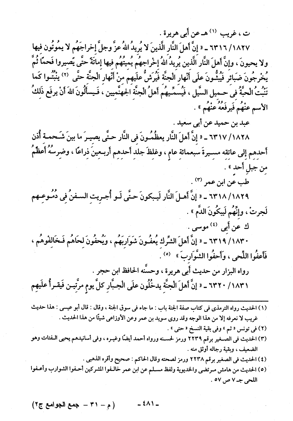 1827/ 6316 - "إِنَّ أهلَ النَّارِ الَّذينَ لا يُرِيدُ اللَّهُ عزَّ وجلَّ إِخراجَهُم لا يمُوتُون فِيها ولا يحيونَ، وإنَّ أهلَ النَّار الَّذين يُرِيدُ اللَّهُ إِخْراجهُم يُميتُهُم فيها إِماتَةً حتَّى يصيروا فَحمًا ثُمَّ يُخْرجُونَ ضَبائِر فَيُبثُّونَ علَى أَنْهارِ الْجنَّةِ فَيُرَشُّ علَيهِمَ مِنْ أَنْهارِ الجنَّةِ حتَّى (¬2) ينْبُتُوا كَما تَنْبُتُ الْحبَّةُ في حمِيل السَّيل، فَيُسمِّيهُم أَهلُ الْجنَّةِ الجهنَّمِيين، فَيسأَلُونَ اللَّهَ أنْ يرفَع ذَلِكُ الأسم عنْهُم فَيرفَعُهُ عنْهُم".