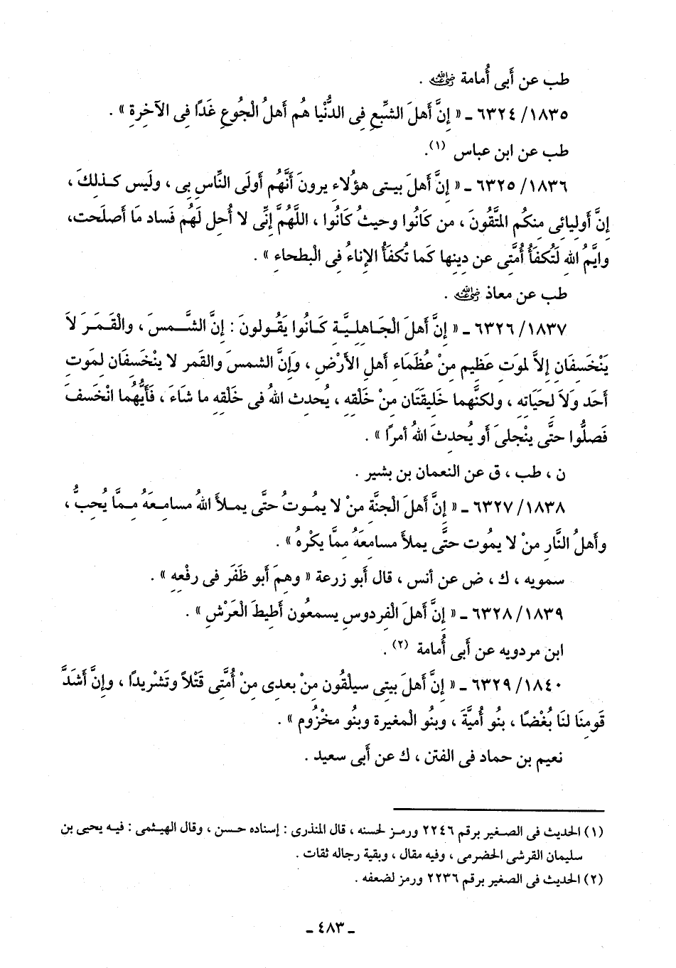 1838/ 6327 - "إِنَّ أَهلَ الجنَّةِ منْ لا يمُوتُ حتَّى يملأَ اللَّهُ مسامِعَهُ مِمَّا يُحِبُّ، وأهلُ النَّارِ منْ لا يمُوت حتَّى يملأَ مسامِعَهُ مِمَّا يكْرهُ".