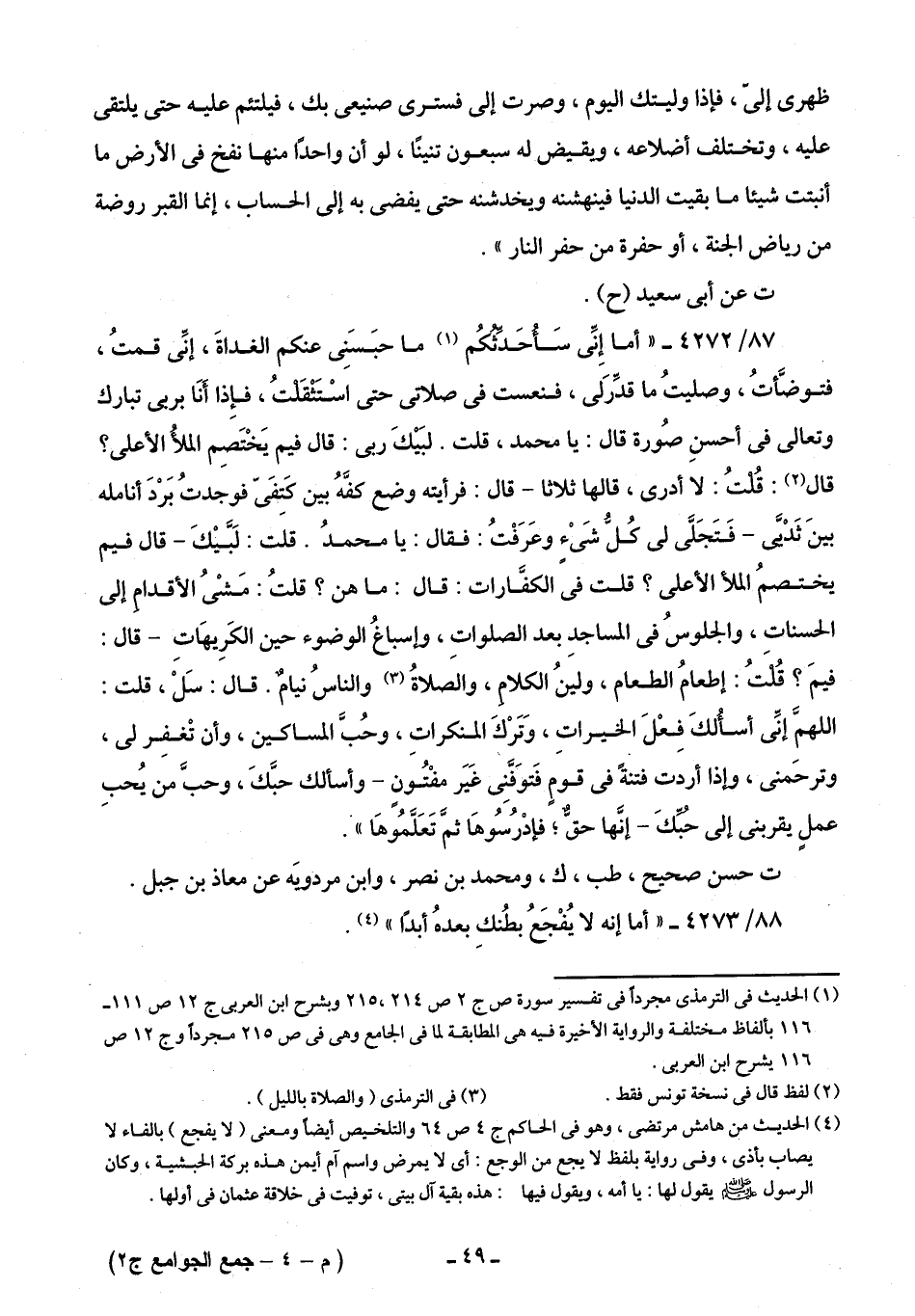 (¬1) الحديث في الترمذي مجردًا في تفسير سورة ص ج 2 ص 215، 214 وبشرح ابن العربي ج 12 ص 111 - 116 بألفاظ مختلفة والرواية الأخيرة فيه هي المطابقة لما في الجامع وهي في ص 215 مجردًا وج 12 ص 116 يشرح ابن العربي.