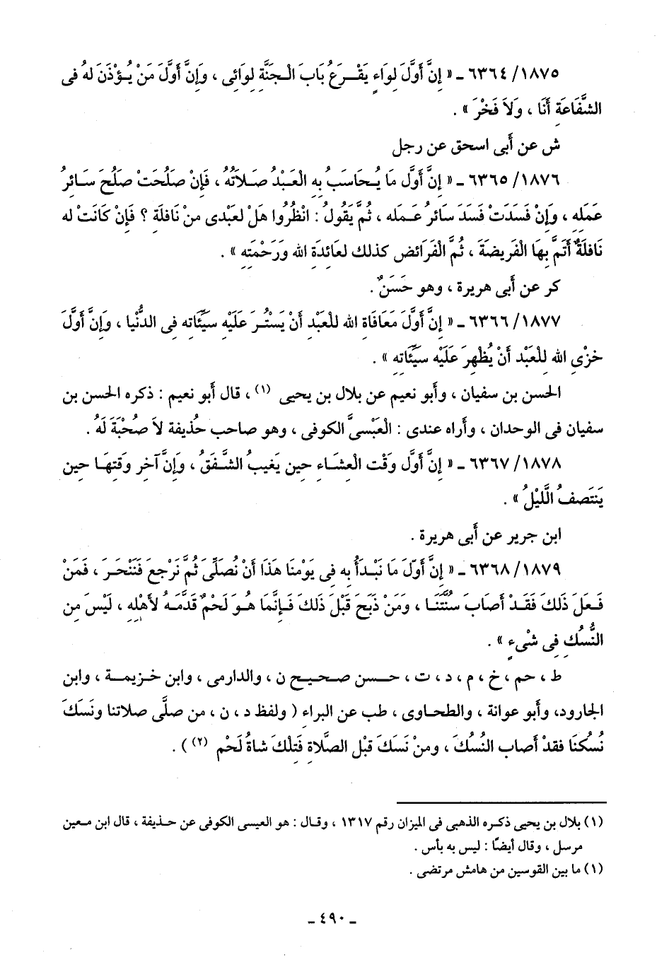 1876/ 6365 - "إِنَّ أَوَّل مَا يُحَاسَبُ بِهِ الْعَبْدُ صَلَاتُهُ، فَإِنْ صَلُحَتْ صَلُحَ سَائِرُ عَمَله، وإِنْ فَسَدَتْ فَسَدَ سَائرُ عَمَله، ثُمَّ يَقُولُ: انْظُرُوا هَلْ لعَبْدى منْ نَافلَةِ؟ فَإِنْ كانَتْ له نَافلَةٌ أتَمَّ بِهَا الْفَريضَةَ، ثُمَّ الْفَرَائض كذلك لعَائِدَةِ اللَّه وَرَحْمَتِهِ".