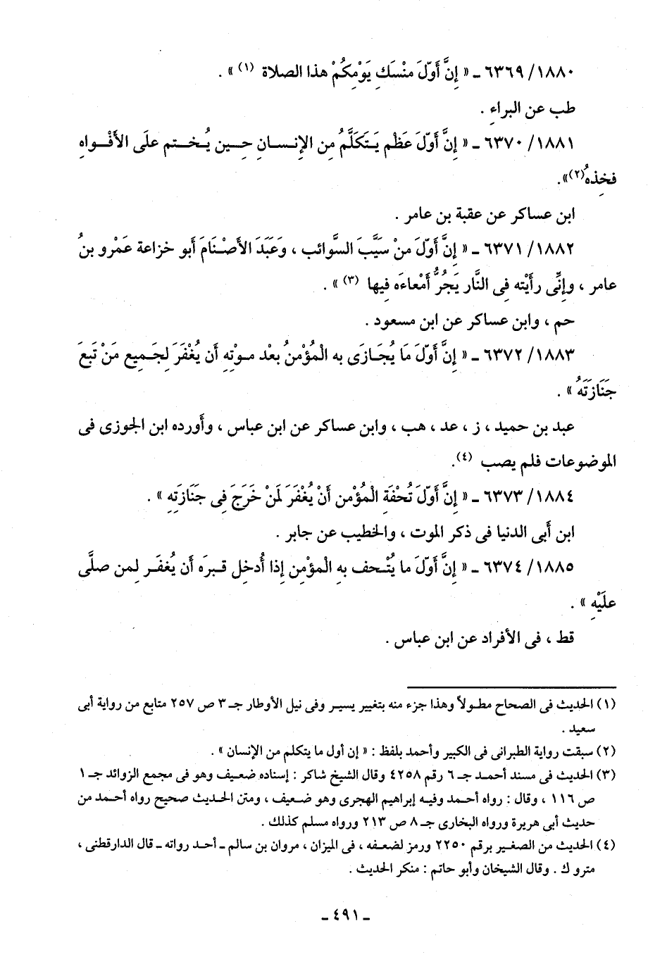1882/ 6371 - "إِنَّ أَوّلَ منْ سَيَّبَ السَّوائب، وَعَبَدَ الأصْنَامَ أَبو خزاعة عَمْرو بنُ عامر، وإِنِّى رأَيْته في النَّار يَجُرُّ أمْعاءَه فِيها (¬3) ".