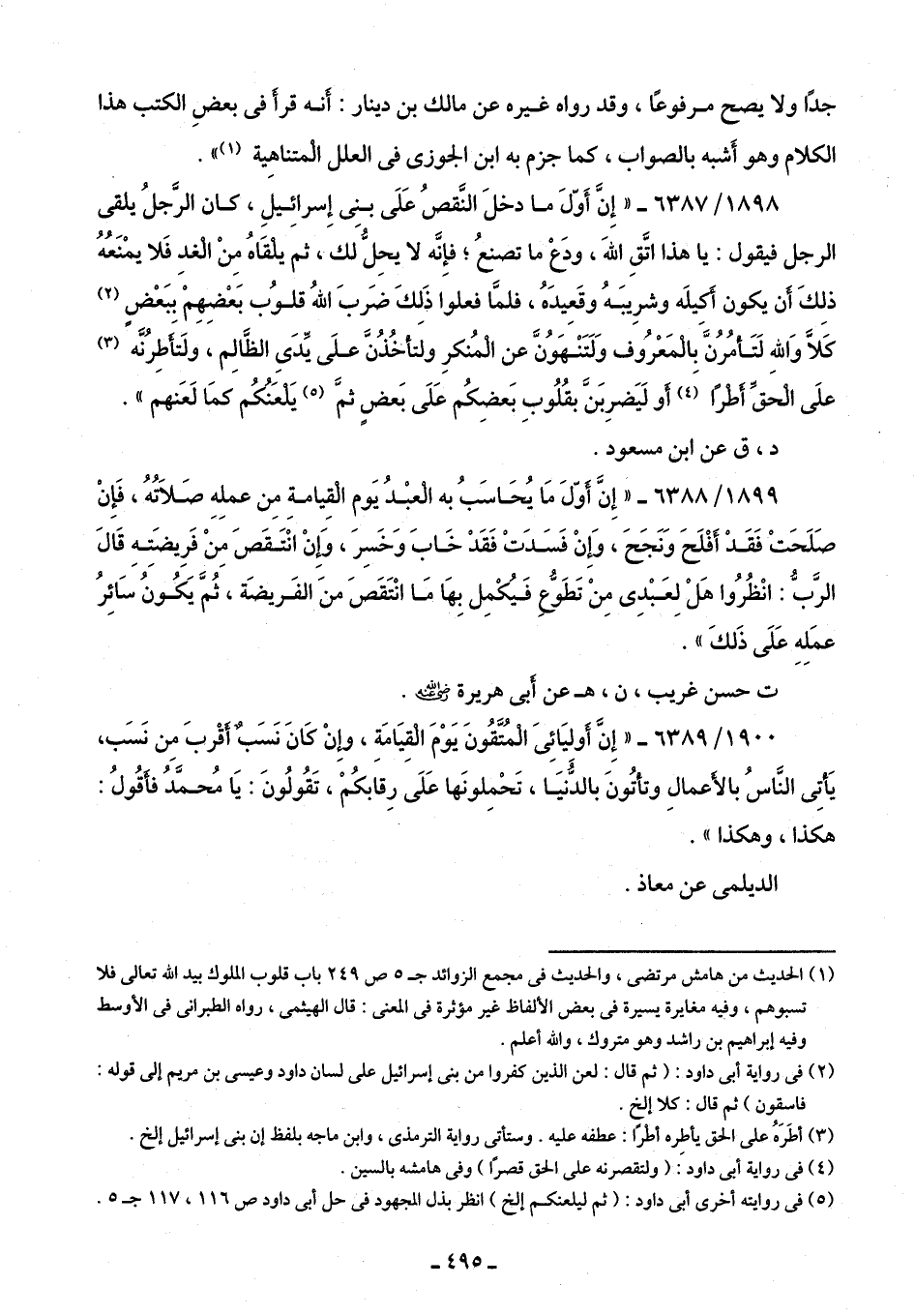 1898/ 6387 - "إِنَّ أَوّلَ ما دخلَ النَّقصُ عَلَى بنِى إِسرائِيلِ، كان الرَّجلُ يلقى الرجل فيقول: يا هذا اتَّقِ اللَّهَ، ودع ما تصنعُ؟ فإِنَّه لا يحِلُّ لك، ثم يلقَاهُ مِنْ الْغدِ فَلا يمْنَعُهُ ذلِكَ أَن يكون أَكيلَه وشرِيبَهُ وقَعِيدَهُ، فلمَّا فعلوا في لِكَ ضَربَ اللَّهُ قلوُب بَعْضِهِمْ ببَعْضٍ (¬2) كَلَّا وَاللَّه لَتَأمُرُنَّ بالمَعْرُوف وَلَتَنْهَوُنَّ عن المُنكرِ ولتأخُذُنَّ علَى يِّدَىِ الظَّالِم، ولَتأَطِرُنَّه (¬3) علَى الْحَقِّ أطرًا (¬4) أو لَيَضرِبَن بقُلُوبِ بَعضِكُم عَلَى بَعضٍ ثمَّ (¬5) يَلعَنُكُم كمَا لَعَنهم".
