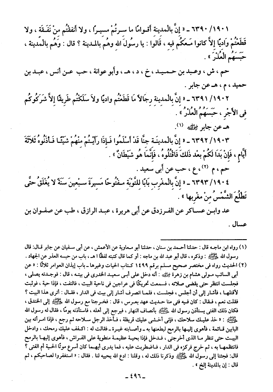 (¬2) الحديث رواه في مختصر صحيح مسلم برقم 1499 كتاب الحيات وغيرها - باب إيذان العوامر ثلاثًا: "عن أبي السائب مولى هشام بن زهرة -رضي اللَّه عنه-: أنه دخل على أبى سعيد الخدرى في بيته، قال: فوجدته يصلى، فجلست انتظر حتى يقضى صلاته، فسمعت تحريكًا في عراجين في ناحية البيت، فالتفت، فإذا حية، فوثبت لأقتلها، فأشار إلى أن أجلس، فجلست، فلما انصرف أشار إلى بيت في الدار، فقال: أترى هذا البيت؟ فقلت نعم، فقال: فإن فيه فتى منا حديث عهد بعرس، قال: فخرجنا مع رسول اللَّه -صلى اللَّه عليه وسلم- إلى الخندق، فكان ذلك الفتى يستأذن رسول اللَّه -صلى اللَّه عليه وسلم- بأنصاف النهار، فيرجع إلى أهله، فاستأذنه يومًا، فقال له رسول اللَّه -صلى اللَّه عليه وسلم-: "خذ عليك سلاحك، فإنى أخشى عليك قريظة، فأخذ الرجل سلاحه ثم رجع، فإذا امرأته بين البابين قائمة، فأهوى إليها بالرمح ليطعنها به -وأصابته غيرة- فقالت له: اكفف عليك رمحك، وادخل البيت حتى تنظر ما الذى أخرجنى، فدخل فإذا بحية عظيمة منطوية على الفراش، فأهوى إليها بالرمح فانتظمها به، ثم خرج فركزه في الدار، فاضطربت عليه، فما يدرى أيهما كان أسرع موتًا الحية أم الفتى؟ قال: فجئنا إلى رسول اللَّه -صلى اللَّه عليه وسلم- وذكرنا ذلك له، وقلنا: ادع اللَّه يحييه لنا. فقال: "استغفروا لصاحبكم، ثم قال: إن بالمدينة الخ".