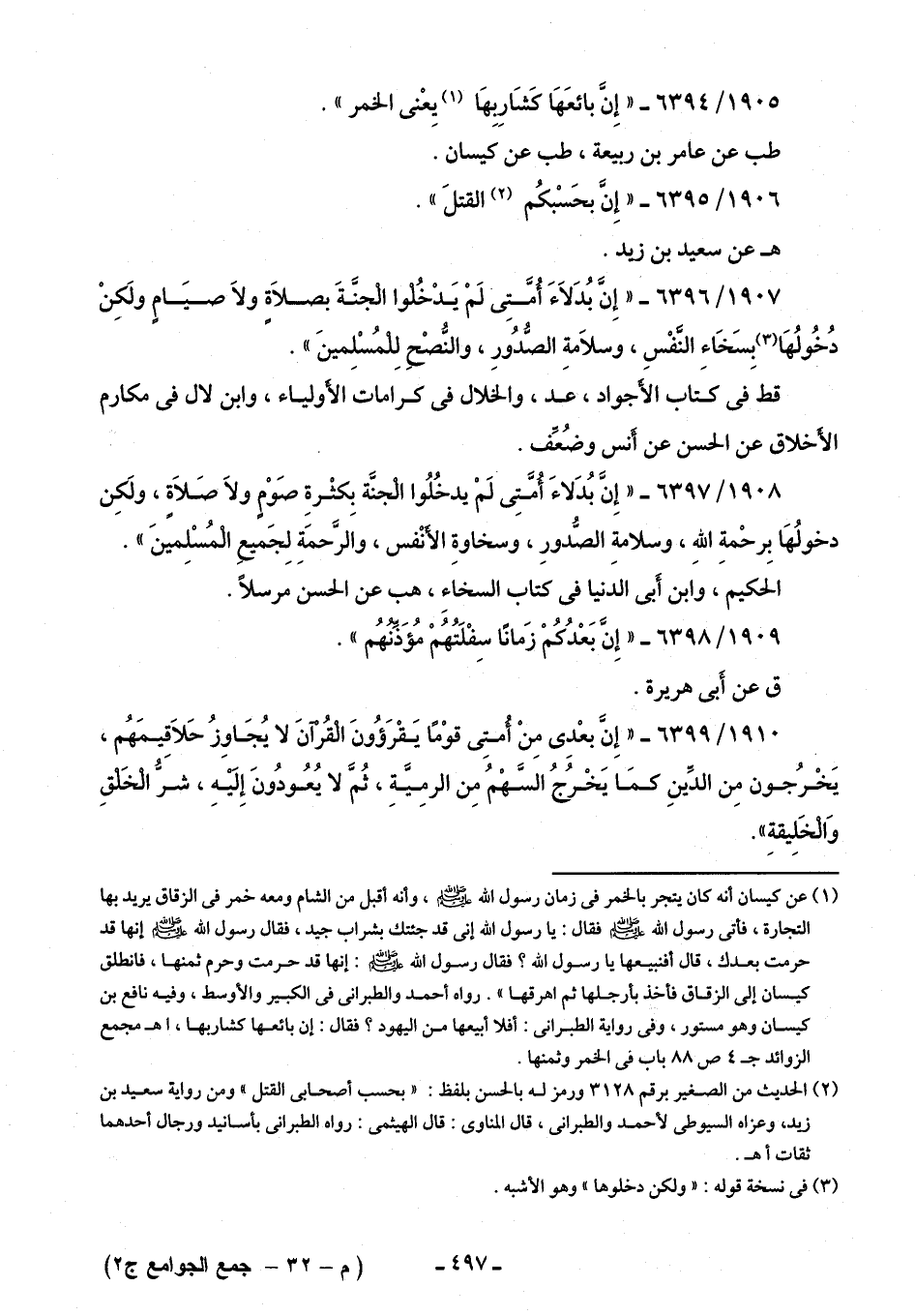 1907/ 6396 - "إِنَّ بُدَلَاءَ أُمَّتِى لَمْ يَدْخُلوا الجنَّةَ بصلَاة ولَا صيَامٍ ولَكِنْ دُخُولُهَا (¬3) بِسَخَاءِ النَّفْسِ، وسلَامةِ الصُّدُورِ، والنُّصْحِ لِلمُسْلِمينَ".