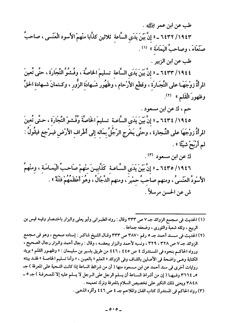 (¬2) الحديث في مسند أحمد جـ 5 رقم 3870 ص 333 وقال الشيخ شاكر: إسناده صحيح، وهو في مجمع الزوائد جـ 7 ص 328، 329، ونسبه لأحمد والبزار ببعضه، وقال: رجال أحمد والبزار رجال الصحيح، ورواه الحاكم بنحوه في المستدرك 4 ص 445، 446 من طريق بشير بن سليمان: "وظهور القلم" يريد الكتابة وهى واضحة في الأصلين بالقاف وفى الزوائد "العلم" بالعين، "وأما تسليم الخاصة" فقد بينته روايات أخري في سند أحمد عن ابن مسعود منها (أن من شرائط الساعة إذا كانت التحية على المعرفة) جـ 5 - 3664 وفيها (إن من أشراط الساعة أن يسلم الرجل على الرجل لا يسلم عليه إلا للمعرفة) جـ 5 - 3848 ويعنى ذلك النكير على تخصيص السلام بالمعرفة وترك تعميمه.