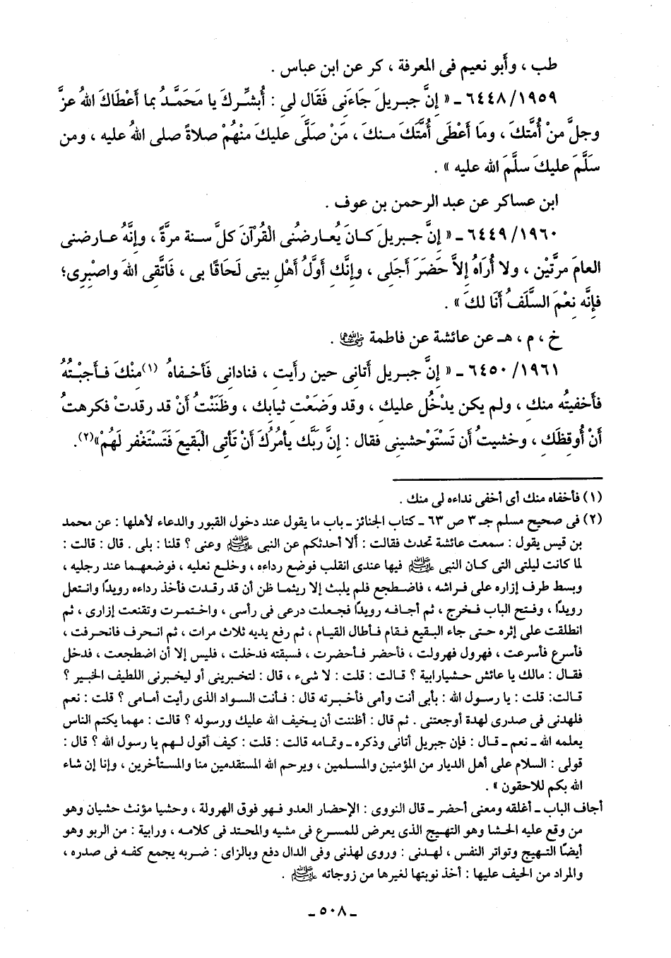 1961/ 6450 - "إِنَّ جبريل أَتانِي حين رأَيتِ، فنادانِي فَأخفاهُ (¬1) مِنْكَ فأَجبْتُهُ فأَخفيتُه منكِ، ولم يكن يدْخُل عليكِ، وقد وَضَعْتِ ثيابِك، وظَنَنْتُ أَنْ قد رقدتْ فكرهتُ أَنْ أُوقِظَكِ، وخشيتُ أَن تَسْتَوْحشينِي فقال: إِنَّ رَبَّك يأْمُرُكَ أَنْ تَأْتِى الْبَقيعَ فَتَسْتَغْفر لَهُمْ" (¬2).