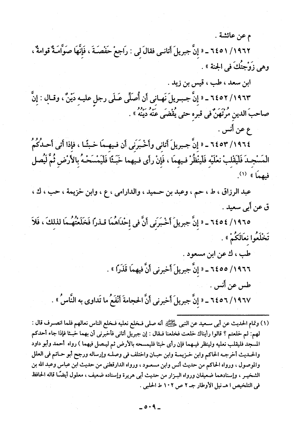 1964/ 6453 - "إِنَّ جبريلَ أَتانِى وأَخْبَرَنِى أَن فيهِمَا خبثًا، فإِذا أَتى أَحدُكُمُ الْمَسْجِدَ فَلْيَقْلِبْ نعْلَيْهِ فَلْينْظُرْ فيهِمَا، فَإِنْ رأَى فيهما خَبَثًا فَلْيَمْسَحْهُ بِالأَرْضِ ثُمَّ لَيُصل فيهمَا" (¬1).