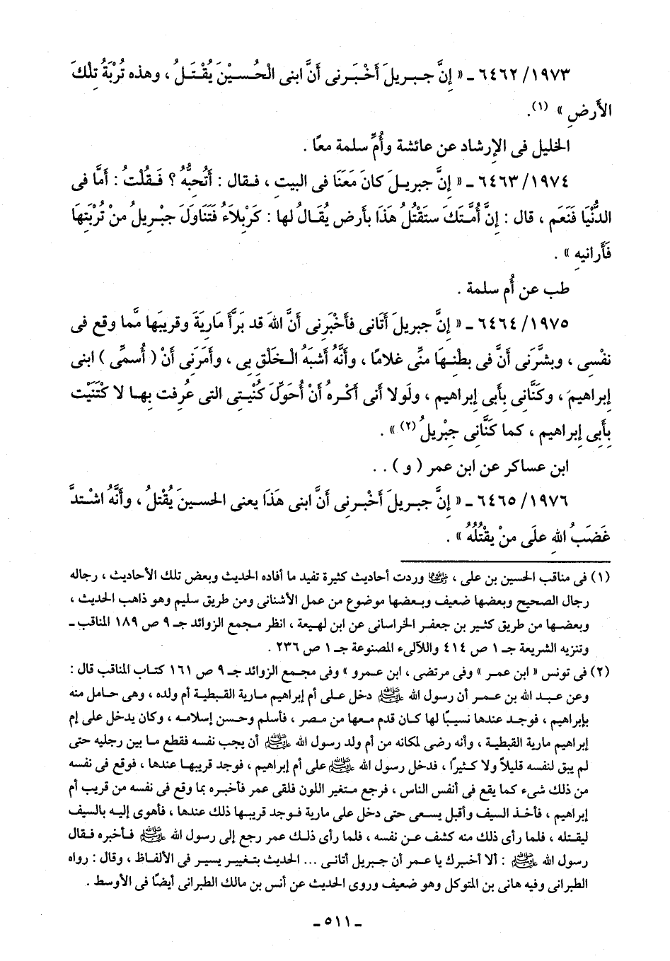 1973/ 6462 - "إِنَّ جبريلَ أَخْبَرنى أَنَّ ابنى الْحُسيْنَ يُقْتَلُ، وهذه تُرْبَةُ تِلْكَ الأَرضِ" (¬1).