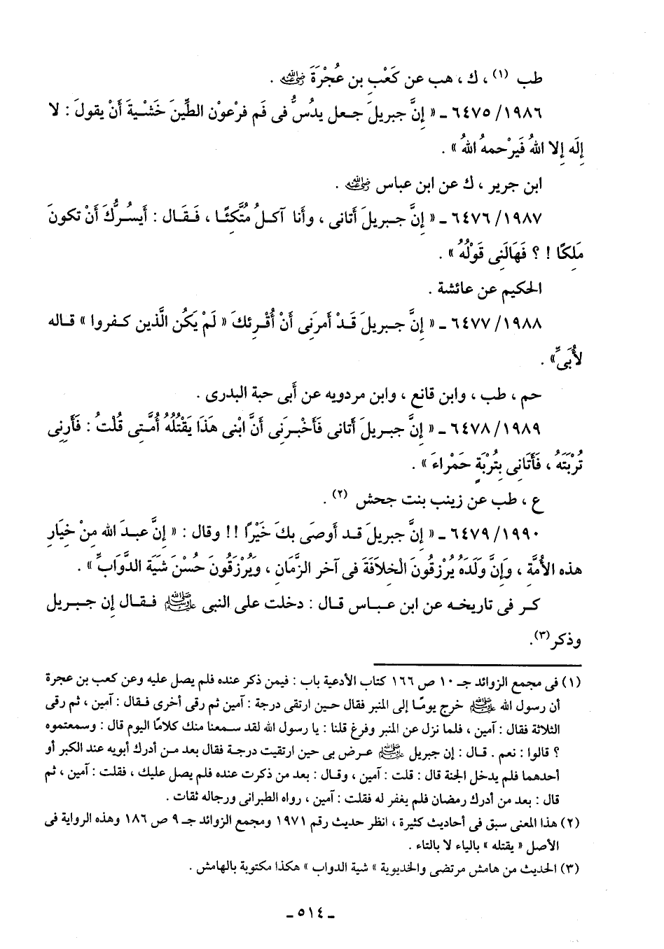 (¬1) في مجمع الزوائد جـ 10 ص 166 كتاب الأدعية باب: فيمن ذكر عنده فلم يصل عليه وعن كعب بن عجرة أن رسول اللَّه -صلى اللَّه عليه وسلم- خرج يومًا إلى المنبر فقال حين ارتقى درجة: آمين ثمَّ رقى أخرى فقال: آمين، ثمَّ رقى الثلاثة فقال: آمين، فلما نزل عن المنبر وفرغ قلنا: يا رسول اللَّه لقد سمعنا منك كلامًا اليوم قال: وسمعتموه؟ قالوا: نعم. قال: إن جبريل -صلى اللَّه عليه وسلم- عرض بي حين ارتقيت درجة فقال بعد من أدرك أبويه عند الكبر أو أحدهما فلم يدخل الجنة قال: قلت: آمين، وقال: بعد من ذكرت عنده فلم يصل عليك، فقلت: آمين، ثمَّ قال: بعد من أدرك رمضان فلم يغفر له فقلت: آمين، رواه الطبرانى ورجاله ثقات.