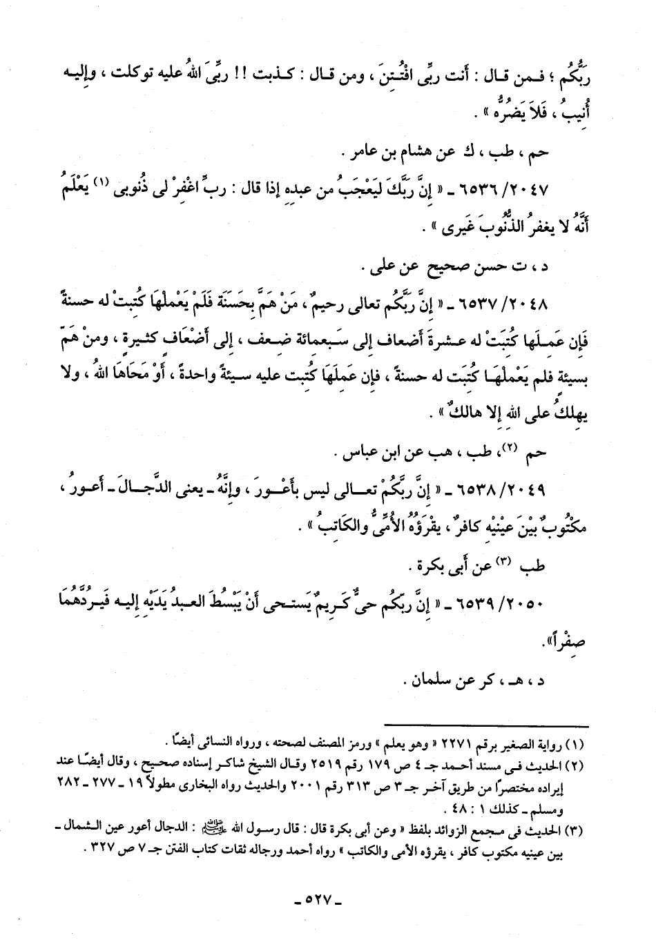 2049/ 6538 - "إِنَّ ربَّكُمْ تعالى ليس بأَعْورَ، وإِنَّهُ -يعنى الدَّجالَ- أَعورُ، مكْتُوبٌ بيْنَ عيْنيْهِ كافرٌ، يقْرَؤُهُ الأُمِّىُّ والكَاتِبُ".