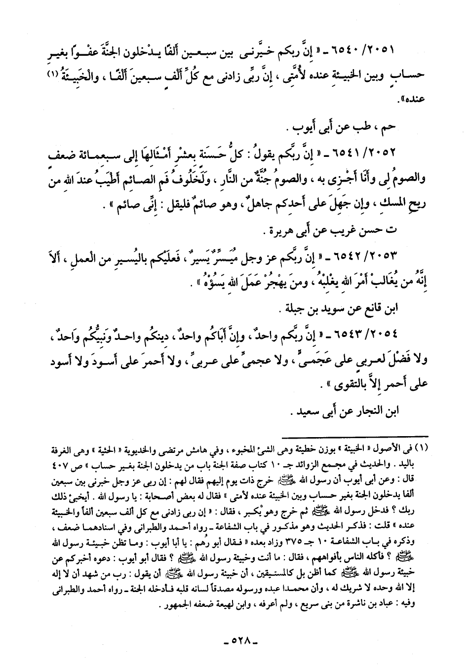 2054/ 6543 - "إِنَّ ربَّكم واحدٌ، وإِنَّ أَبَاكُم واحدٌ، دِينكُم واحدٌ وَنبِيُّكُم وَاحدٌ، ولا فَضْلَ لعربىٍ على عَجَمىٍّ، ولا عجمىِّ على عربىِّ، ولا أَحمرَ على أَسودَ ولا أَسود على أَحمر إِلَّا بالتقوى".