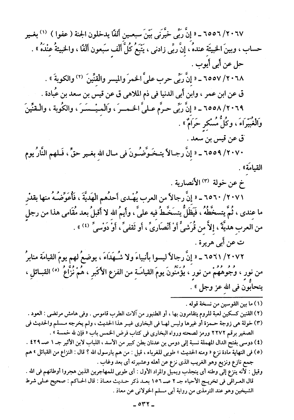 2068/ 6557 - "إِنَّ رَبِّى حرب علىَّ الخمرَ والميسر والْقِنِّينَ (¬2) والكوبةَ".