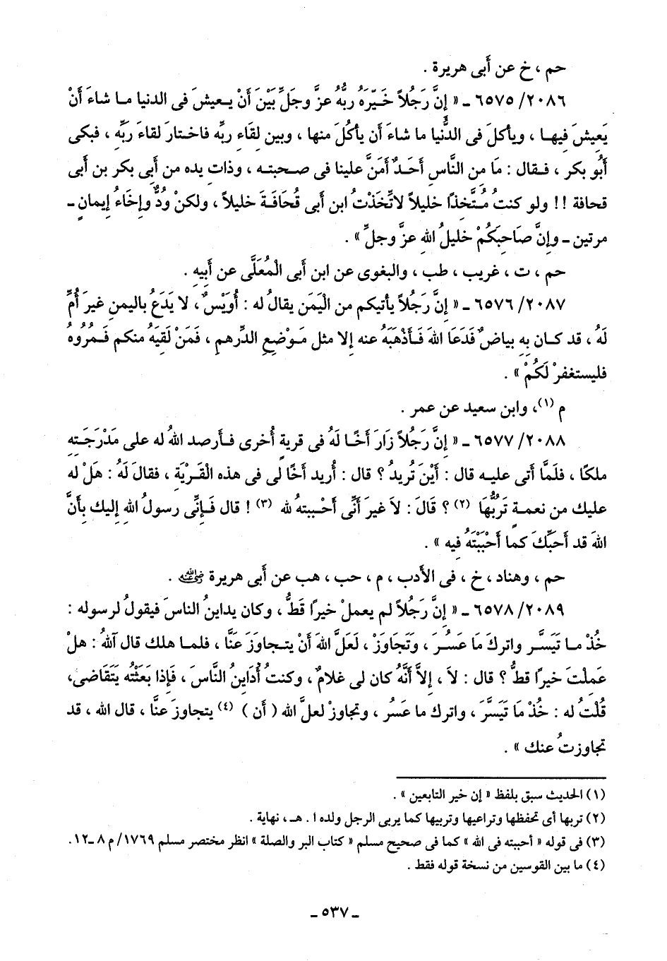 2088/ 6577 - "إِنّ رَجُلًا زَارَ أخًا لَهُ في قرية أُخرى فأرصد اللَّهُ له على مَدْرَجَتِهِ ملكًا، فلَمَّا أتى عليه قال: أَيْنَ تُريدُ؟ قال: أُريد أخًا لى في هذه الْقَرْيَةِ، فقالَ لَهُ: هَلْ لَهَ عليك من نعمة تَربُهَا (¬2)؟ قَالَ: لَا غيرَ أَنِّى أحْببتهُ للَّه (¬3)! قال فَإِنِّى رسولُ اللَّهِ إِليك بِأَنَّ اللَّهَ قد أَحبِّكَ كما أحْبَبْتَهُ فِيه".