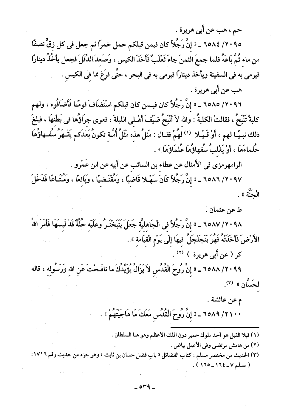 2099/ 6588 - "إِنَّ رُوحَ الْقُدُسِ لَا يَزَالُ يُؤيِّدُكَ ما نافَحْتَ عَنِ اللَّهِ وَرَسُولِهِ، قاله لِحَسَّان" (¬3).